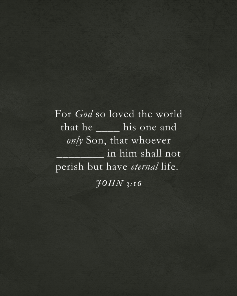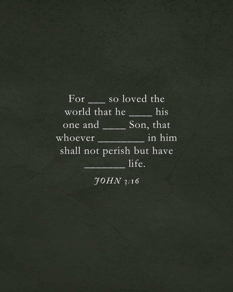 Juan 3:16 Porque tanto amó Dios al mundo que dio a su único Hijo, para que todo aquel que cree en él no perezca, sino que tenga vida eterna.