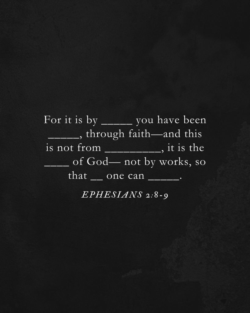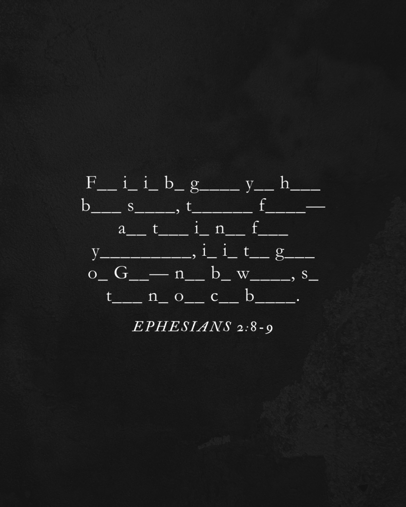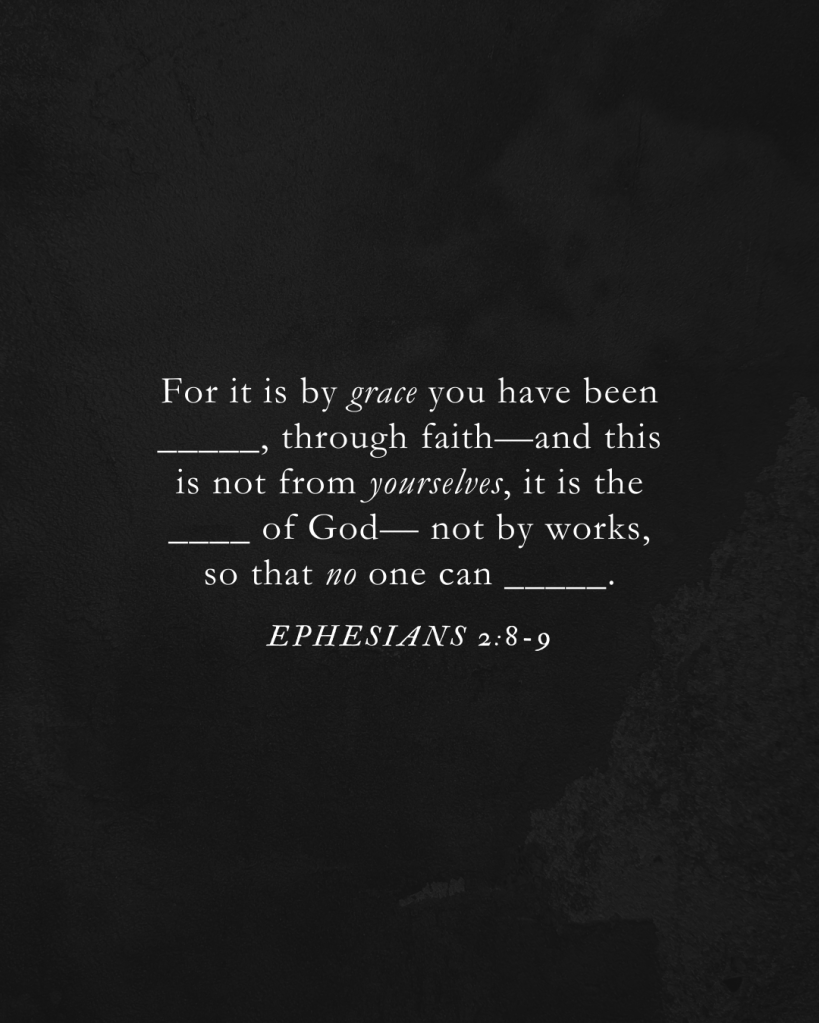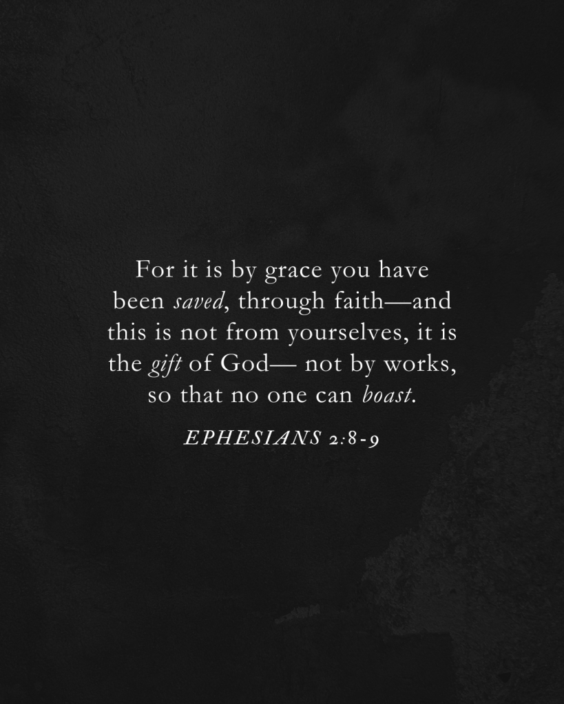 以 弗 所 書 2:8-9 – 你 們 得 救 是 本 乎 恩 , 也 因 著 信 ; 這 並 不 是 出 於 自 己 , 乃 是 神 所 賜 的 ;也 不 是 出 於 行 為 , 免 得 有 人 自 誇 。
