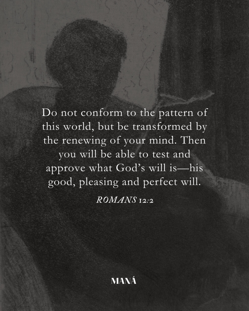 Do not conform to the pattern of this world, but be transformed by the renewing of your mind. Then you will be able to test and approve what God’s will is—his good, pleasing and perfect will.