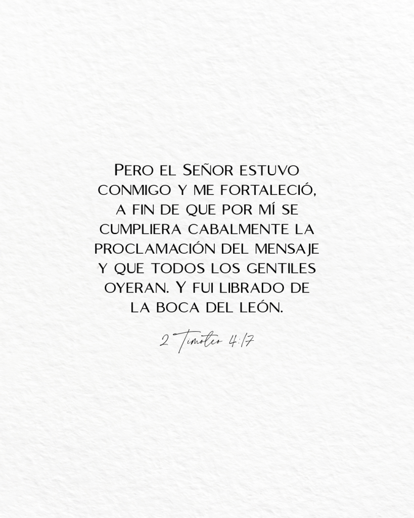Pero el Señor estuvo conmigo y me fortaleció, a fin de que por mí se cumpliera cabalmente la proclamación del mensaje y que todos los gentiles oyeran. Y fui librado de la boca del león.