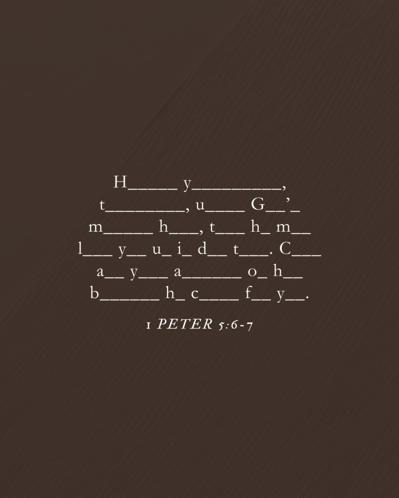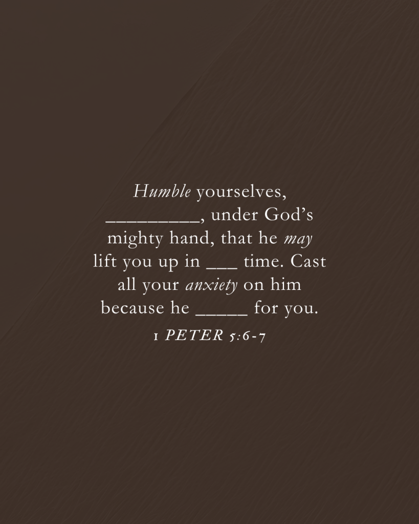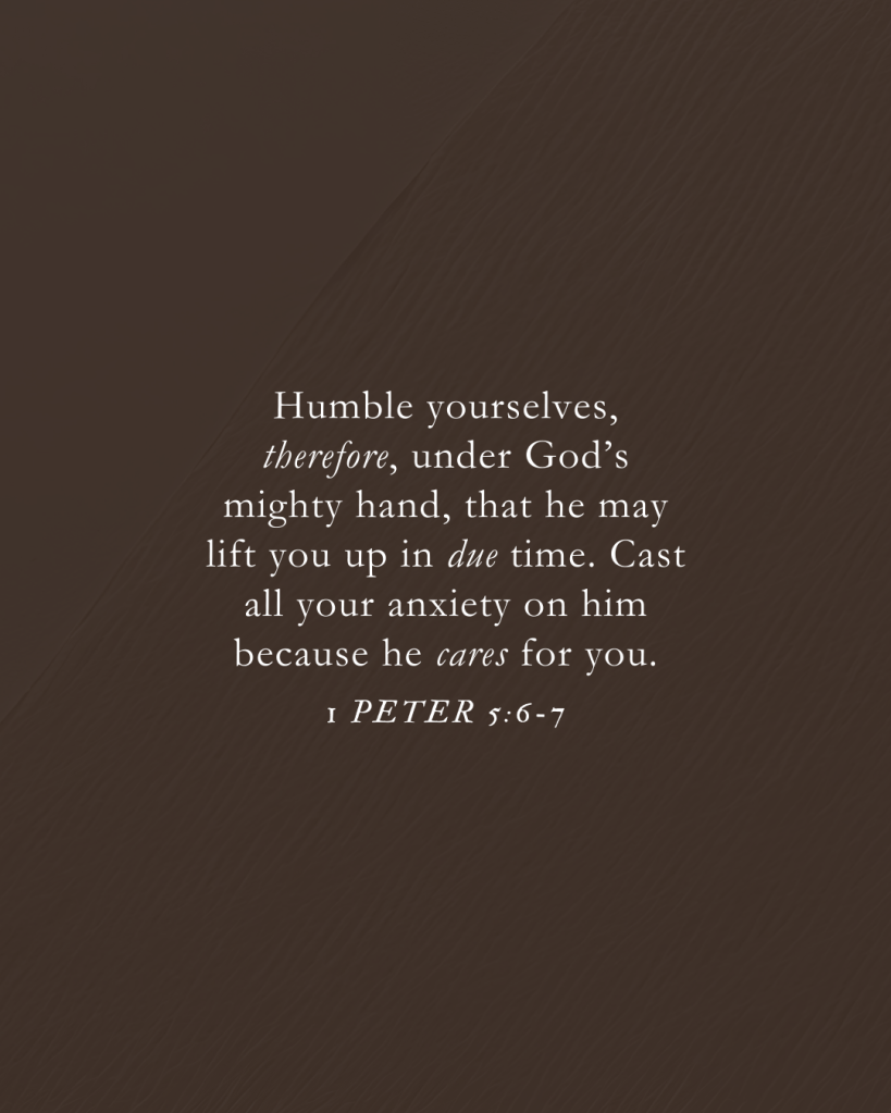 Humíllense, pues, bajo la poderosa mano de Dios, para que Él los exalte a su debido tiempo, echando toda su ansiedad sobre Él, porque Él tiene cuidado de ustedes.