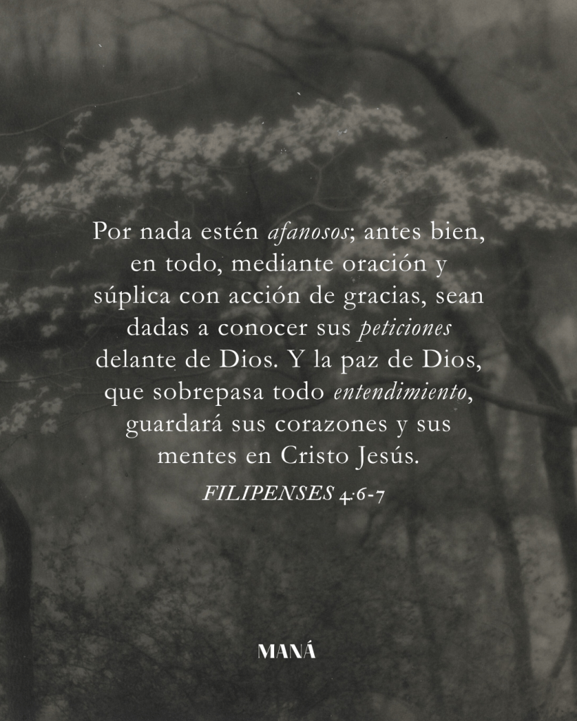 6 Por nada estén afanosos; antes bien, en todo, mediante oración y súplica con acción de gracias, sean dadas a conocer sus peticiones delante de Dios. 7 Y la paz de Dios, que sobrepasa todo entendimiento, guardará sus corazones y sus mentes en Cristo Jesús.
