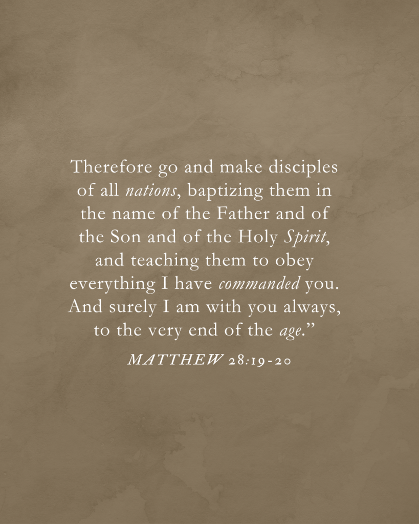 allez donc dans le monde entier, faites des disciples parmi tous les peuples, baptisez-les au nom du Père, du Fils et du Saint-Esprit et enseignez-leur à obéir à tout ce que je vous ai prescrit. Et voici : je suis moi-même avec vous tous les jours, jusqu’à la fin du monde.