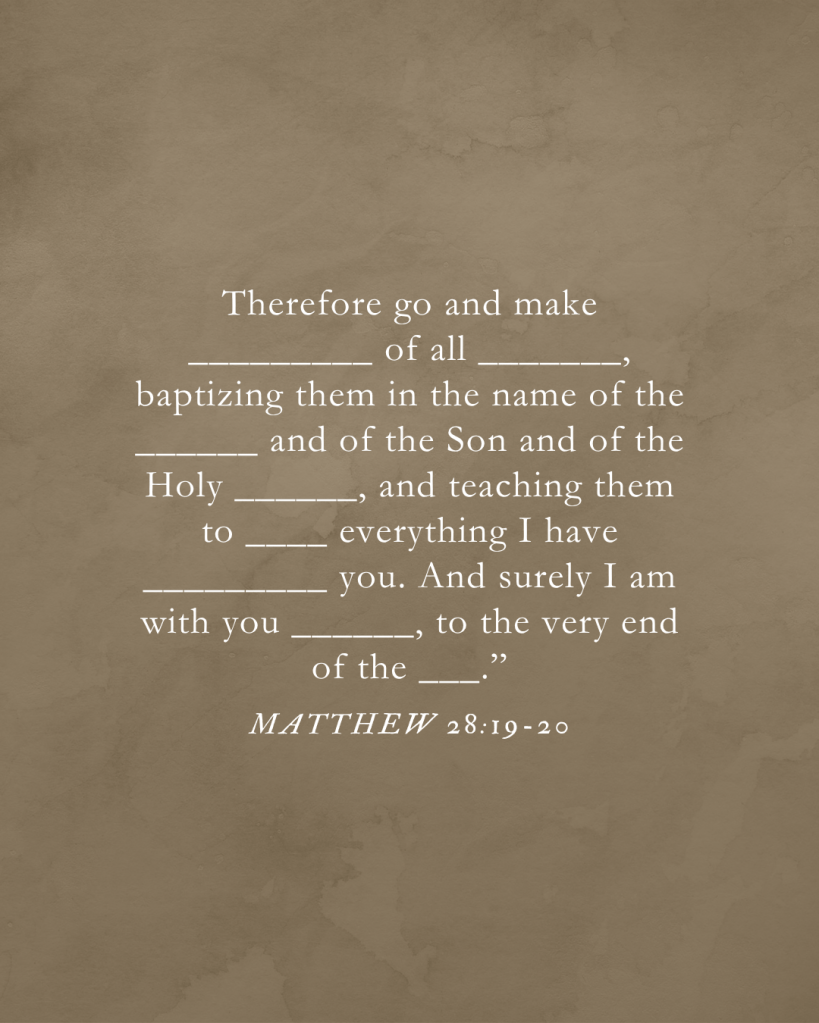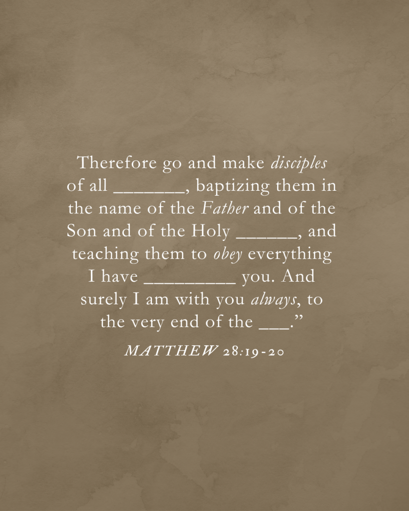 Vayan, pues, y hagan discípulos de todas las naciones, bautizándolos en el nombre del Padre y del Hijo y del Espíritu Santo, enseñándoles a guardar todo lo que les he mandado; y ¡recuerden! Yo estoy con ustedes todos los días, hasta el fin del mundo».