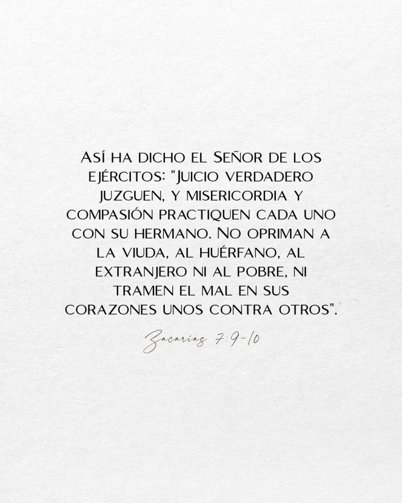 Entonces vino la palabra del Señor a Zacarías: «Así ha dicho el Señor de los ejércitos: “Juicio verdadero juzguen, y misericordia y compasión practiquen cada uno con su hermano. No opriman a la viuda, al huérfano, al extranjero ni al pobre, ni tramen el mal en sus corazones unos contra otros”.