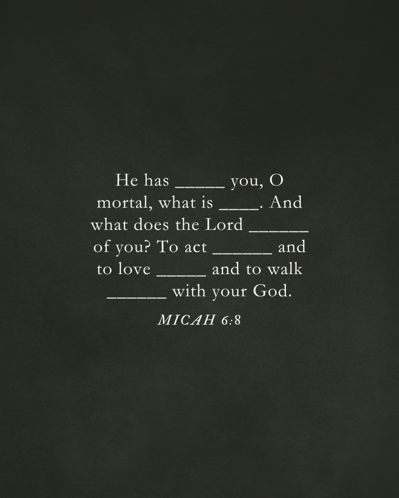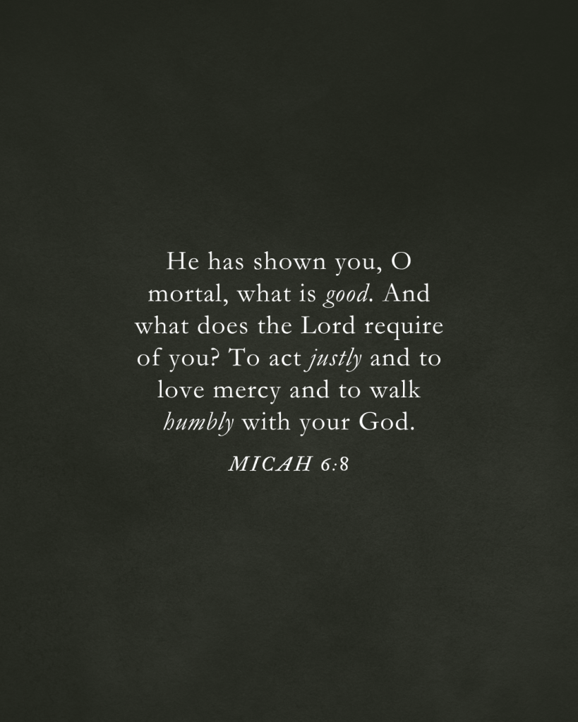 世 人 哪 , 耶 和 華 已 指 示 你 何 為 善 。 他 向 你 所 要 的 是 甚 麼 呢 ? 只 要 你 行 公 義 , 好 憐 憫 , 存 謙 卑 的 心 , 與 你 的 神 同 行 。