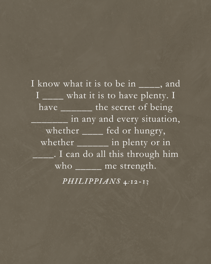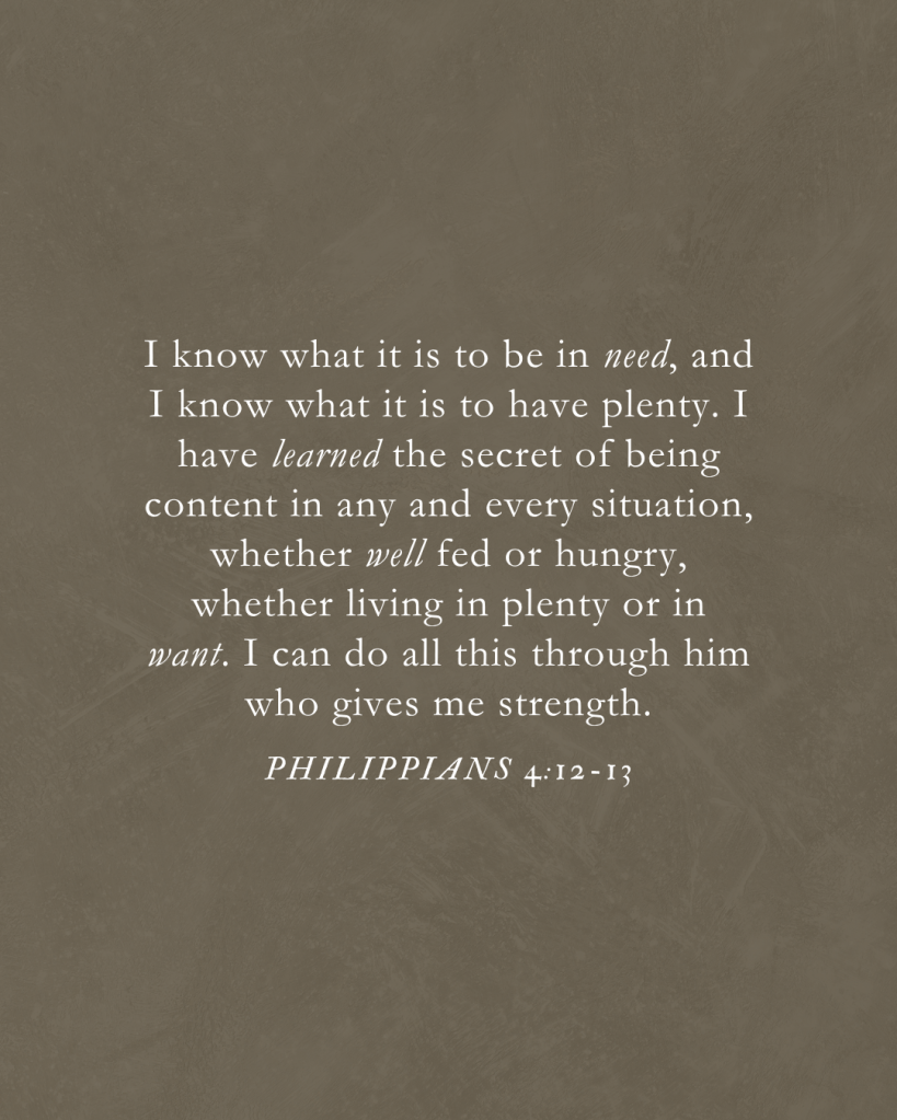 Sé vivir en pobreza, y sé vivir en prosperidad. En todo y por todo he aprendido el secreto tanto de estar saciado como de tener hambre, de tener abundancia como de sufrir necesidad. Todo lo puedo en Cristo que me fortalece.
