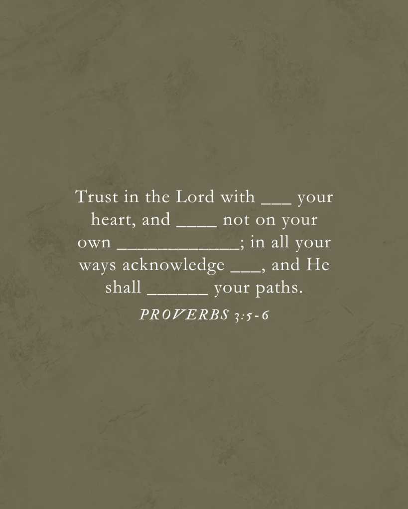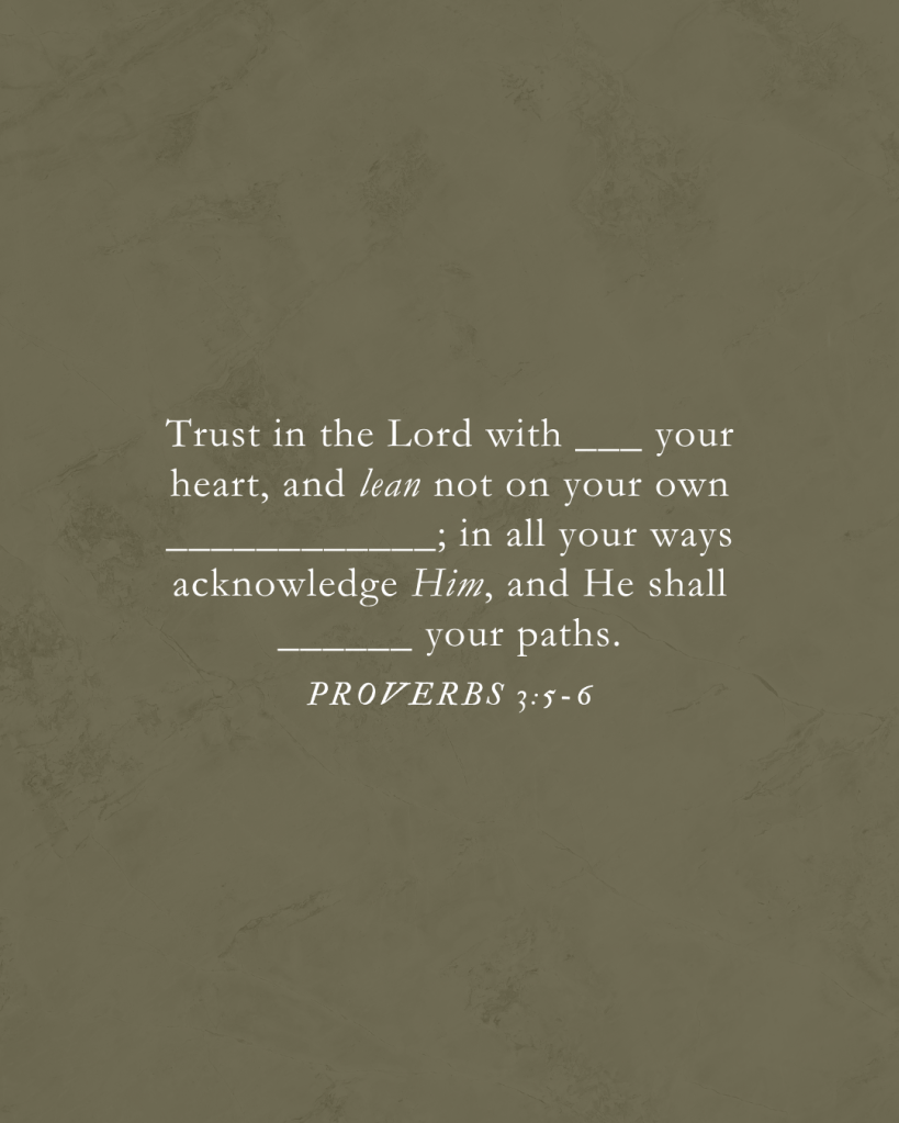 ثِقْ بِاللهِ مِنْ كُلِّ قَلْبِكَ، وَلَا تَتَكِلْ عَلَى فَهمِكَ. اعرِفْهُ فِي كُلِّ سُبُلِكَ، وَهُوَ سَيُمَهِّدُ طُرُقَكَ.