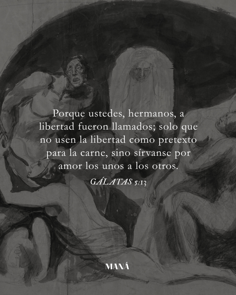 Porque ustedes, hermanos, a libertad fueron llamados; solo que no usen la libertad como pretexto para la carne, sino sírvanse por amor los unos a los otros. Porque toda la ley en una palabra se cumple en el precepto: «Amarás a tu prójimo como a ti mismo». Pero si ustedes se muerden y se devoran unos a otros, tengan cuidado, no sea que se consuman unos a otros.