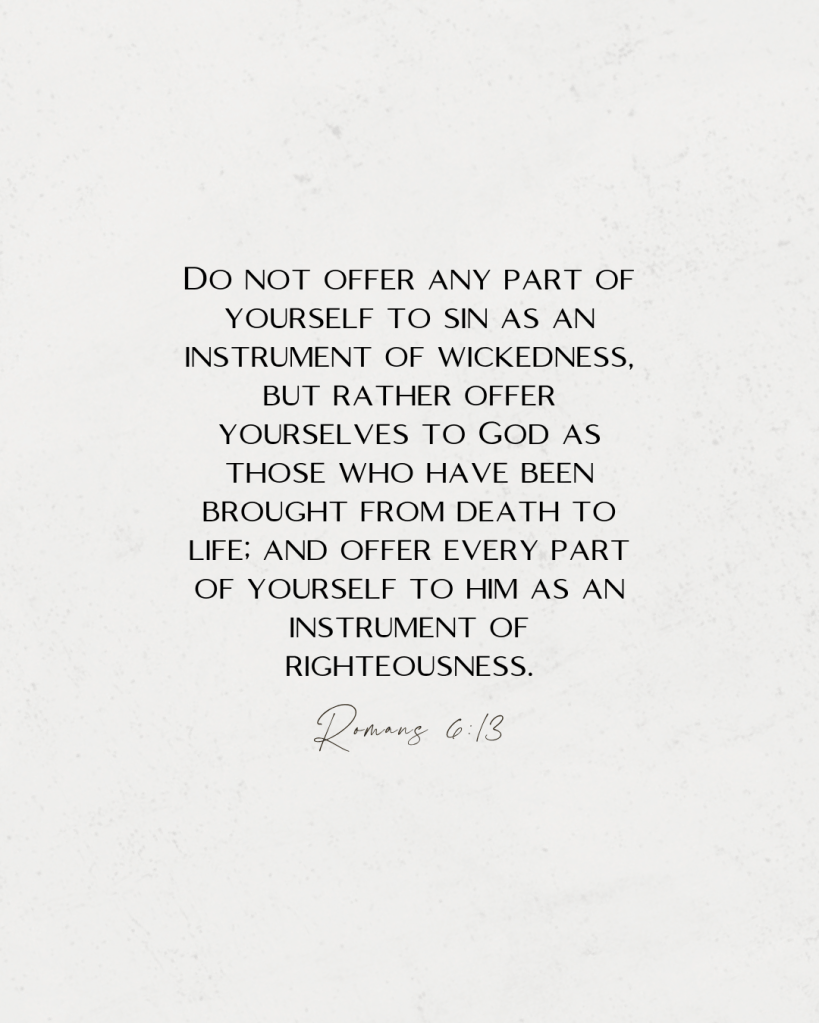 Another part of being a living sacrifice is to be disciplined in following God’s commands for holy living, which often requires us to sacrifice the human desires that tempt us. As it says in Romans 6:12-13, “Therefore do not let sin reign in your mortal body so that you obey its evil desires. Do not offer any part of yourself to sin as an instrument of wickedness, but rather offer yourselves to God as those who have been brought from death to life, and offer every part of yourself to him as an instrument of righteousness.”