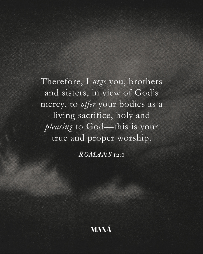 Therefore, I urge you, brothers and sisters, in view of God’s mercy, to offer your bodies as a living sacrifice, holy and pleasing to God—this is your true and proper worship.