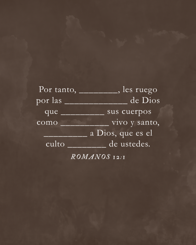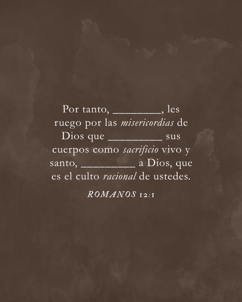 Therefore, I urge you, brothers and sisters, in view of God’s mercy, to offer your bodies as a living sacrifice, holy and pleasing to God—this is your true and proper worship.