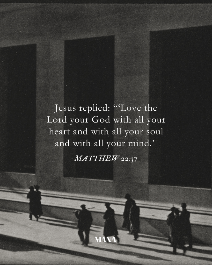 Jesus replied: “‘Love the Lord your God with all your heart and with all your soul and with all your mind.’ This is the first and greatest commandment. And the second is like it: ‘Love your neighbor as yourself.’ All the Law and the Prophets hang on these two commandments.”