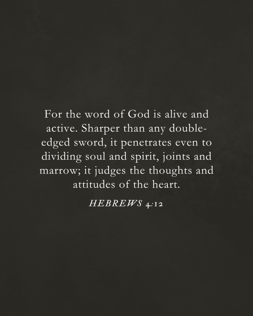 Car la Parole de Dieu est vivante et efficace. Elle est plus tranchante que toute épée à double tranchant et, pénétrant jusqu’à la division de l’âme ainsi que de l’esprit, et des jointures ainsi que de la moelle, elle juge les dispositions et les pensées du cœur.