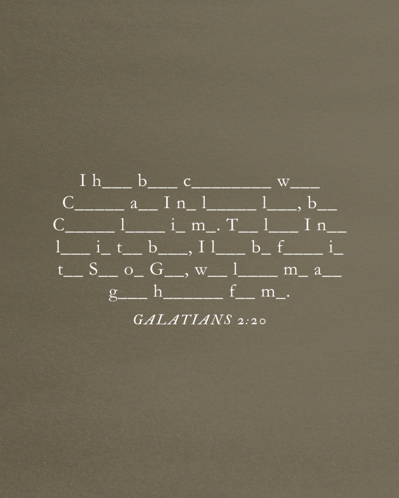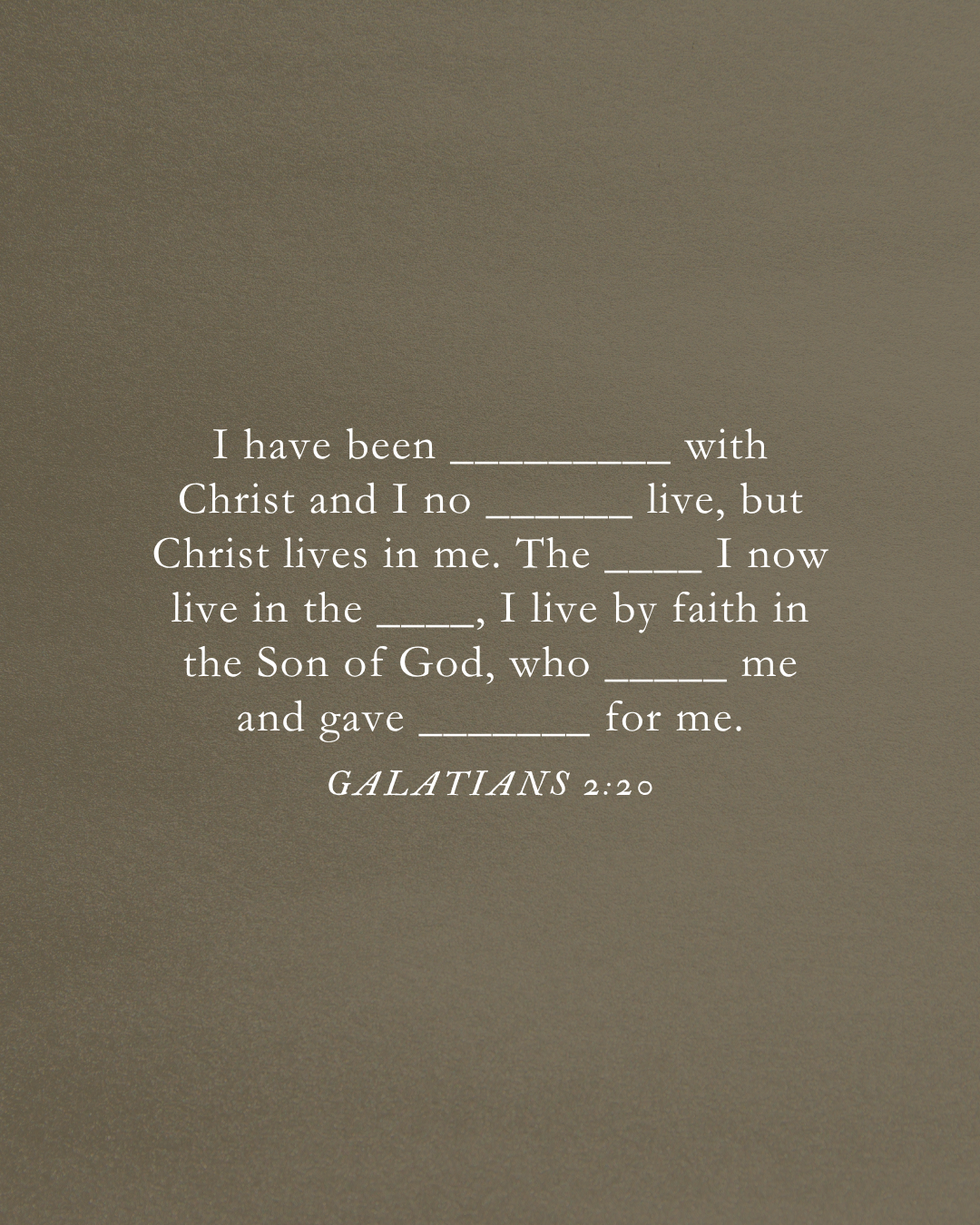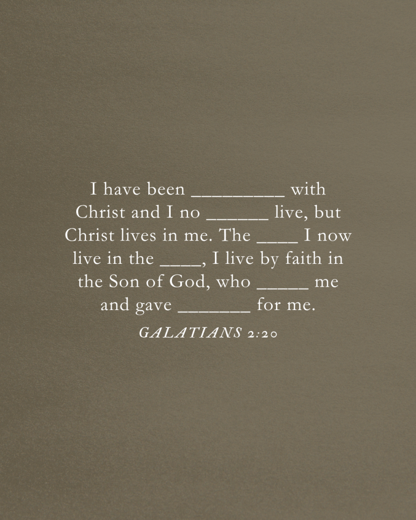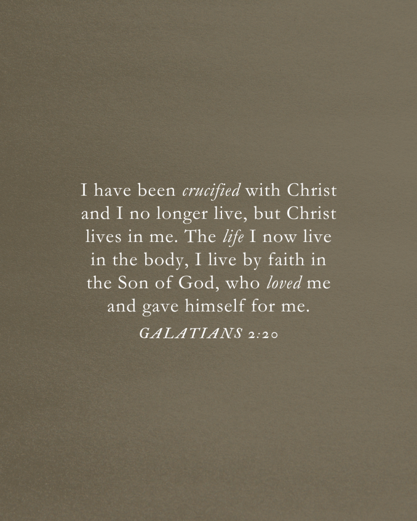 Con Cristo he sido crucificado, y ya no soy yo el que vive, sino que Cristo vive en mí; y la vida que ahora vivo en la carne, la vivo por la fe en el Hijo de Dios, el cual me amó y se entregó a sí mismo por mí.