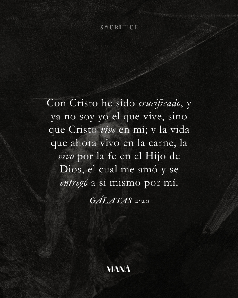 Con Cristo he sido crucificado, y ya no soy yo el que vive, sino que Cristo vive en mí; y la vida que ahora vivo en la carne, la vivo por la fe en el Hijo de Dios, el cual me amó y se entregó a sí mismo por mí.