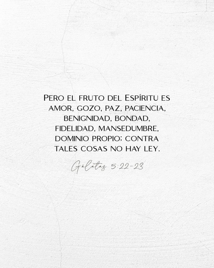 En Gálatas 5:22-23 el apóstol Pablo enumera el fruto del Espíritu, que son rasgos de carácter que son producidos por el Espíritu Santo en nuestra vida cuando caminamos en el Espíritu. Estos son amor, gozo, paz, paciencia, benignidad, bondad, fe, mansedumbre y dominio propio. A medida que permanecemos en Jesús -pasando tiempo meditando en las Escrituras, orando, adorando, teniendo comunión con otros creyentes- el resultado de esto es una mayor evidencia del fruto del Espíritu en mi vida. ¿Nos estamos volviendo más amorosos? ¿Somos pacificadores? ¿De nuestras vidas emanan bondad y amabilidad?
