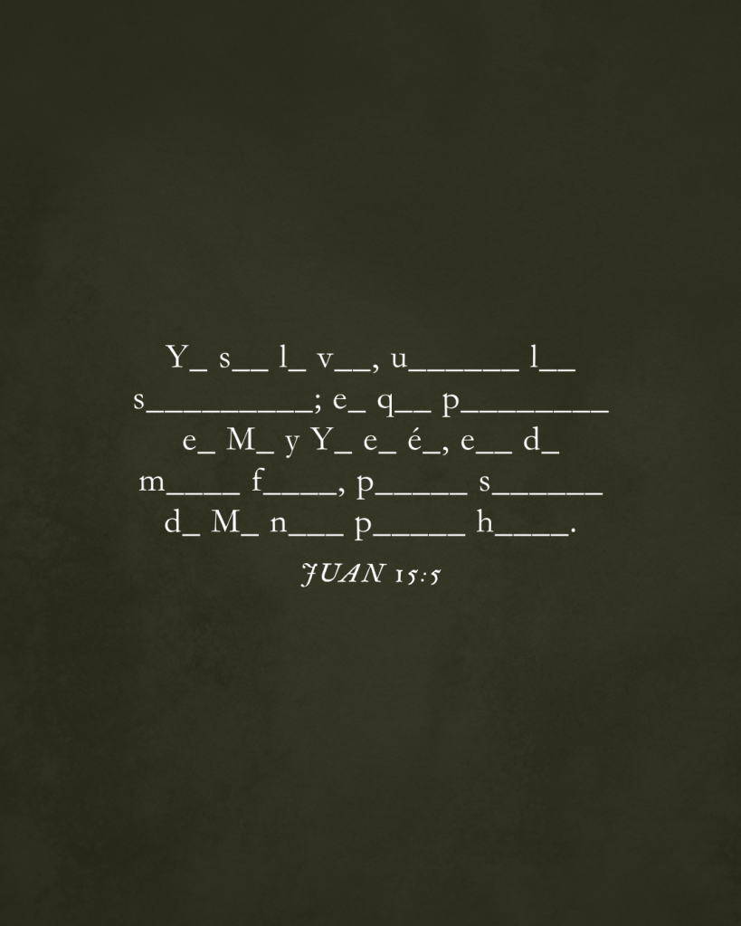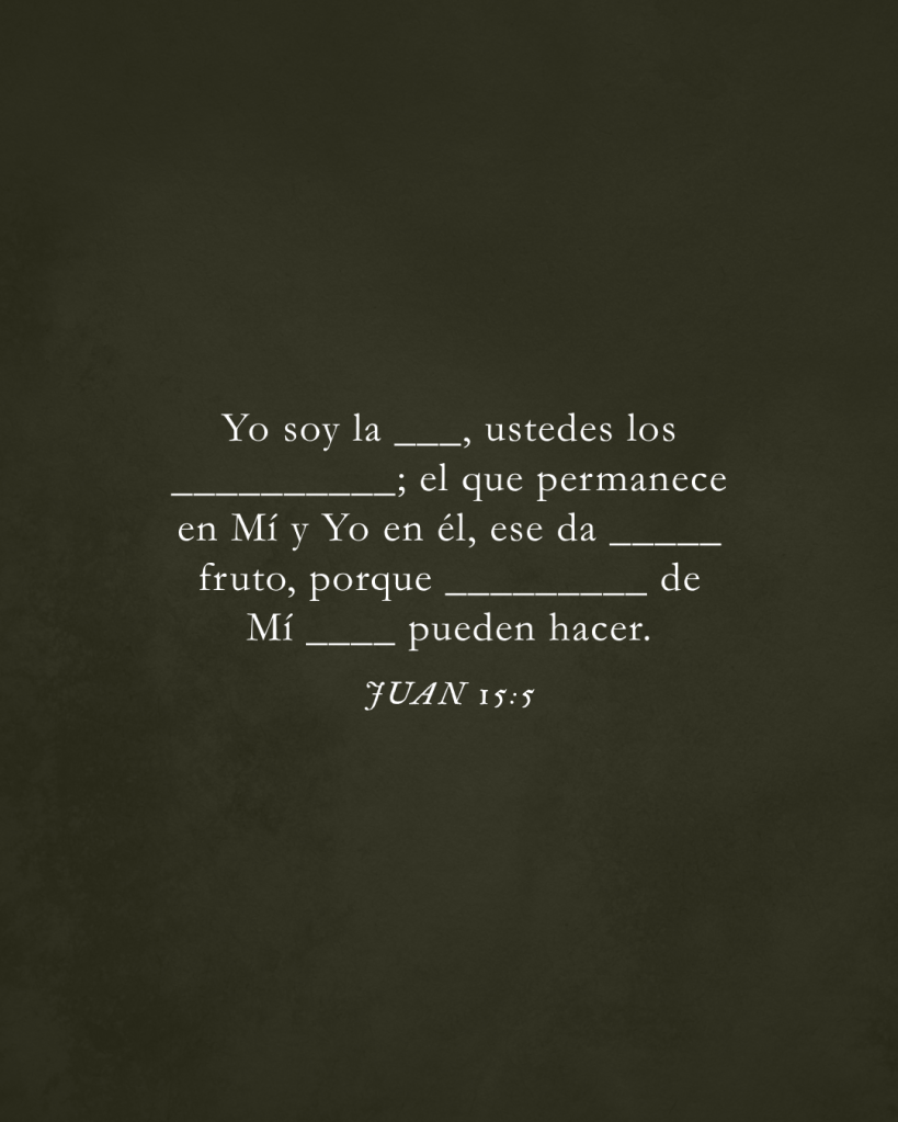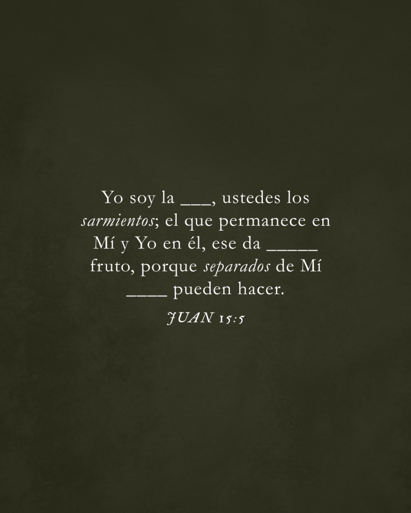 أنَا الكَرمَةُ، وَأنْتُمُ الأغْصَانُ. فَمَنْ يَثْبُتُ فِيَّ وَأثبُتُ أنَا فِيهِ، يُنتِجُ ثَمَرًا كَثِيرًا. فَأنْتُمْ لَا تَسْتَطِيعُونَ أنْ تَفْعَلُوا شَيْئًا بِدُونِي.
