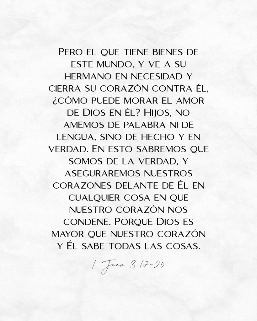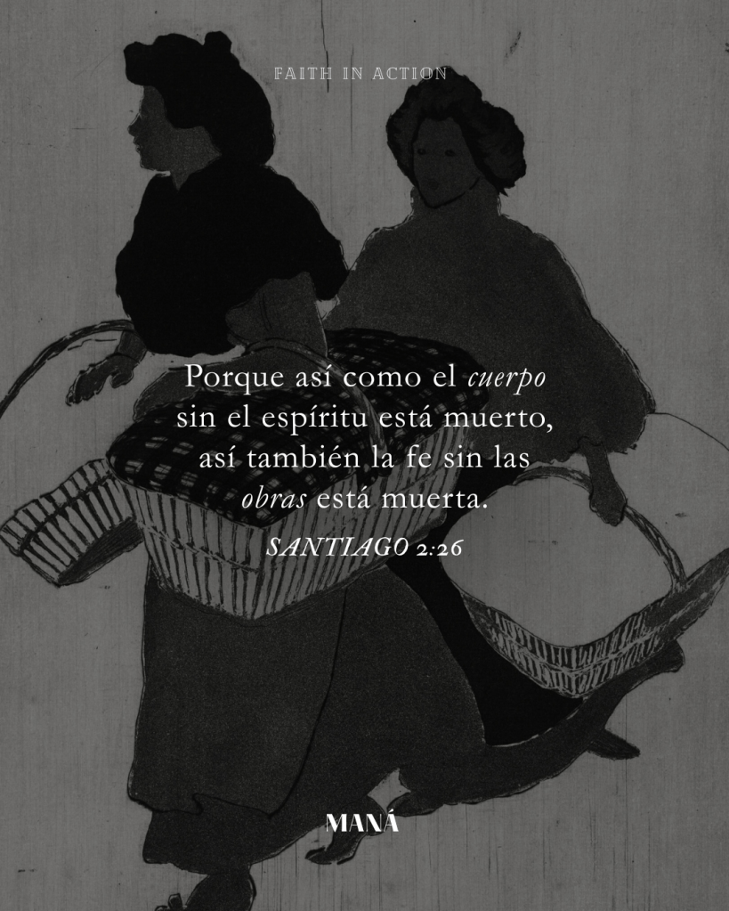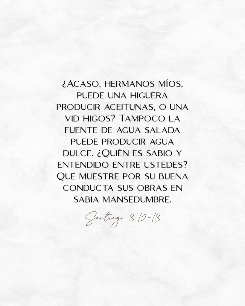 Santiago se centra en la fe como la creencia en que hay un solo Dios, lo cual no es suficiente por sí solo para hacernos hijos de Dios. Me hace pensar en una canción que cantábamos en la iglesia cuando éramos niños: “Por nuestro amor nos conocerán como cristianos”. Si creemos y aceptamos a Jesús como el camino a nuestra salvación, hay un cambio en nuestra manera de actuar que debe acompañar esa creencia. Ese cambio debe incluir el esfuerzo por ser obedientes a Dios y debe incluir el amor por los demás, que fueron creados a su imagen.