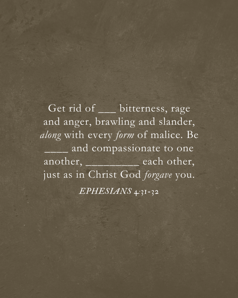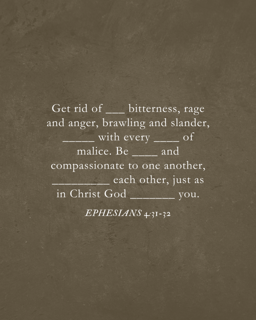 Sea quitada de ustedes toda amargura, enojo, ira, gritos, insultos, así como toda malicia. Sean más bien amables unos con otros, misericordiosos, perdonándose unos a otros, así como también Dios los perdonó en Cristo.