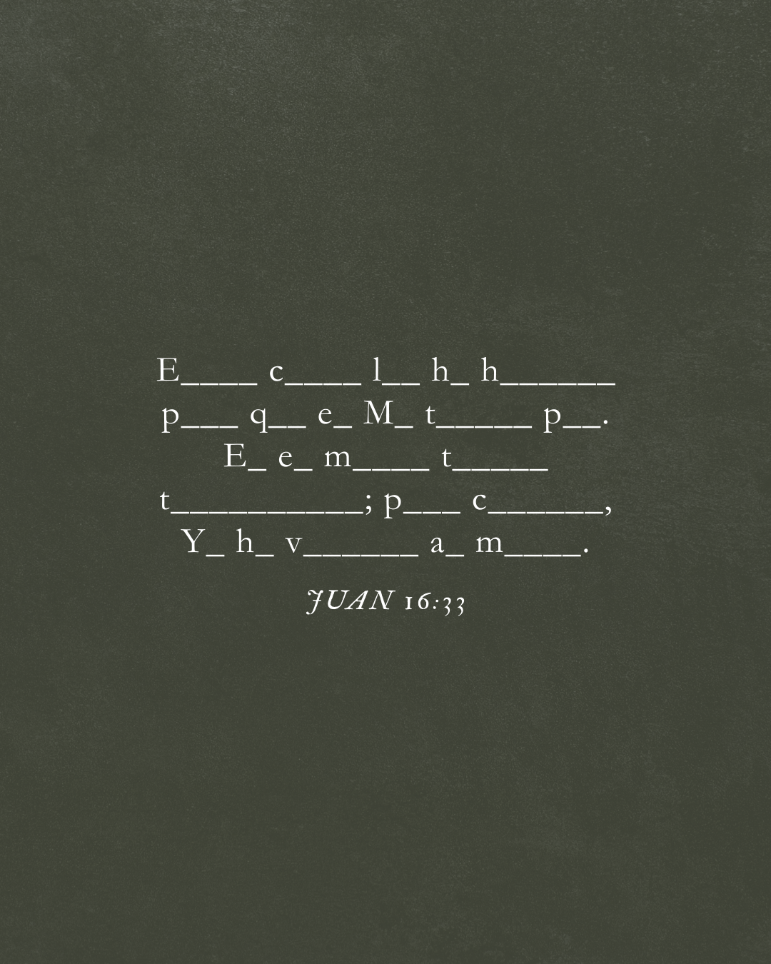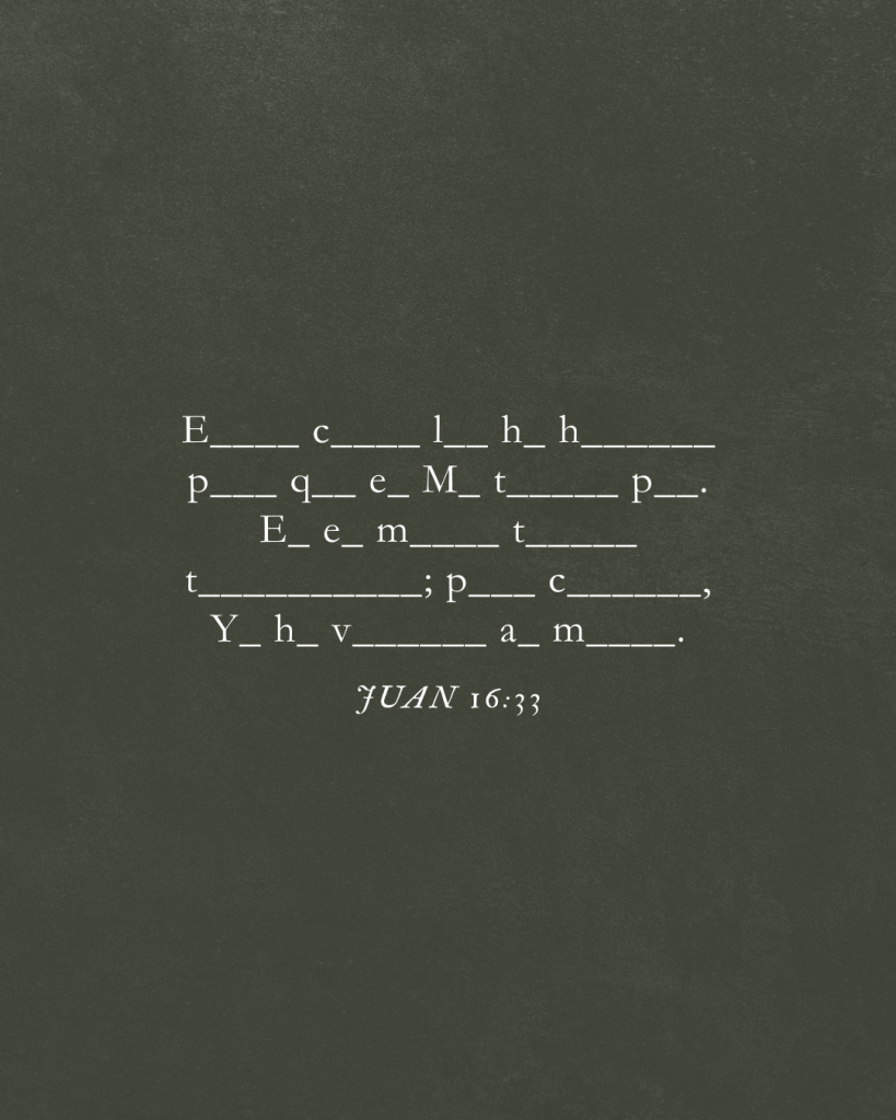 «أخبَرتُكُمْ بِهَذَا لِكَي يَكُونَ لَكُمْ سَلَامٌ مِنْ خِلَالِي. سَتُواجِهُونَ ضِيقًا فِي العَالَمِ، لَكِنْ تَشَجَّعُوا فَأنَا قَدِ انتَصَرتُ عَلَى العَالَمِ.»