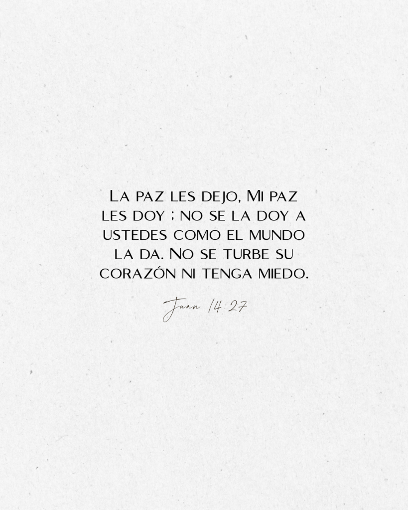 Juan describe las últimas horas que él y los discípulos pasaron con Jesús antes de su muerte en Juan 13-17. Él registra estos recuerdos para nosotros con el mismo conocimiento con el que lo leemos: Jesús sería traicionado y moriría, pero volvería a la vida. En estos pocos capítulos, aprendemos lo que quedó grabado en la memoria de Juan como las últimas palabras de Jesús antes de este evento histórico crucial. Un tema que se destaca es la promesa de paz de Jesús a sus seguidores, incluso cuando enfrentaba un inmenso sufrimiento más allá de lo que la mayoría de nosotros podemos imaginar. Sabemos, basados en las oraciones y súplicas de Jesús en el jardín de Getsemaní, que lo que enfrentaba no estaba exento de mucho dolor y tristeza para él. Era completamente humano y experimentó el sufrimiento con la misma intensidad que cualquiera de nosotros experimentaría si fuéramos golpeados, traspasados y colgados en una cruz para morir. Sin embargo, eligió una resolución pacífica para enfrentar la tortura y la muerte que lo esperaban a fin de alcanzar el gozo mayor de nuestra salvación (Hebreos 12:2).