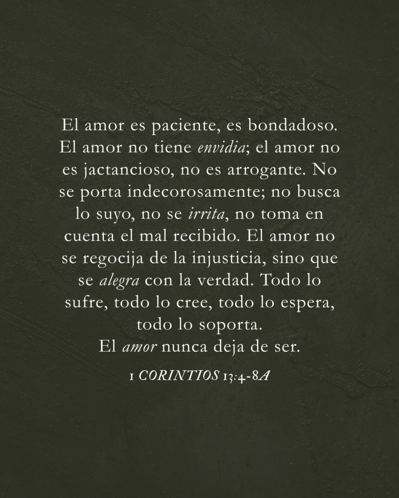 L’amour est patient, il est plein de bonté. Il n’envie pas, il ne se vante pas, il n’est pas orgueilleux. Il ne déshonore pas les autres, il n’est pas égoïste, il ne s’irrite pas, il ne garde pas de trace des torts. L’amour ne se réjouit pas du mal, mais se réjouit de la vérité. Il protège toujours, fait toujours confiance, espère toujours, persévère toujours.
