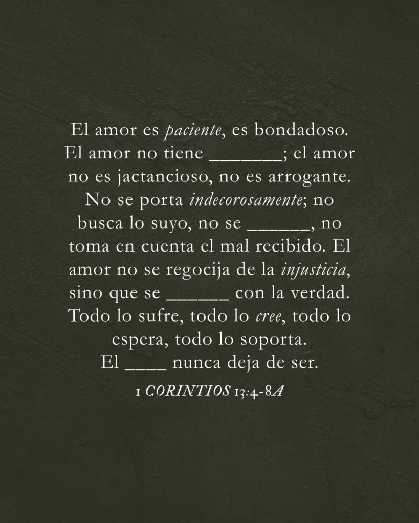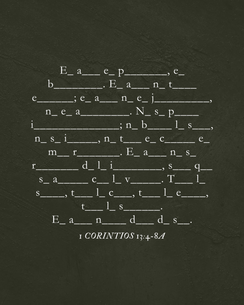 Love is patient, love is kind. It does not envy, it does not boast, it is not proud. It does not dishonor others, it is not self-seeking, it is not easily angered, it keeps no record of wrongs. Love does not delight in evil but rejoices with the truth. It always protects, always trusts, always hopes, always perseveres.