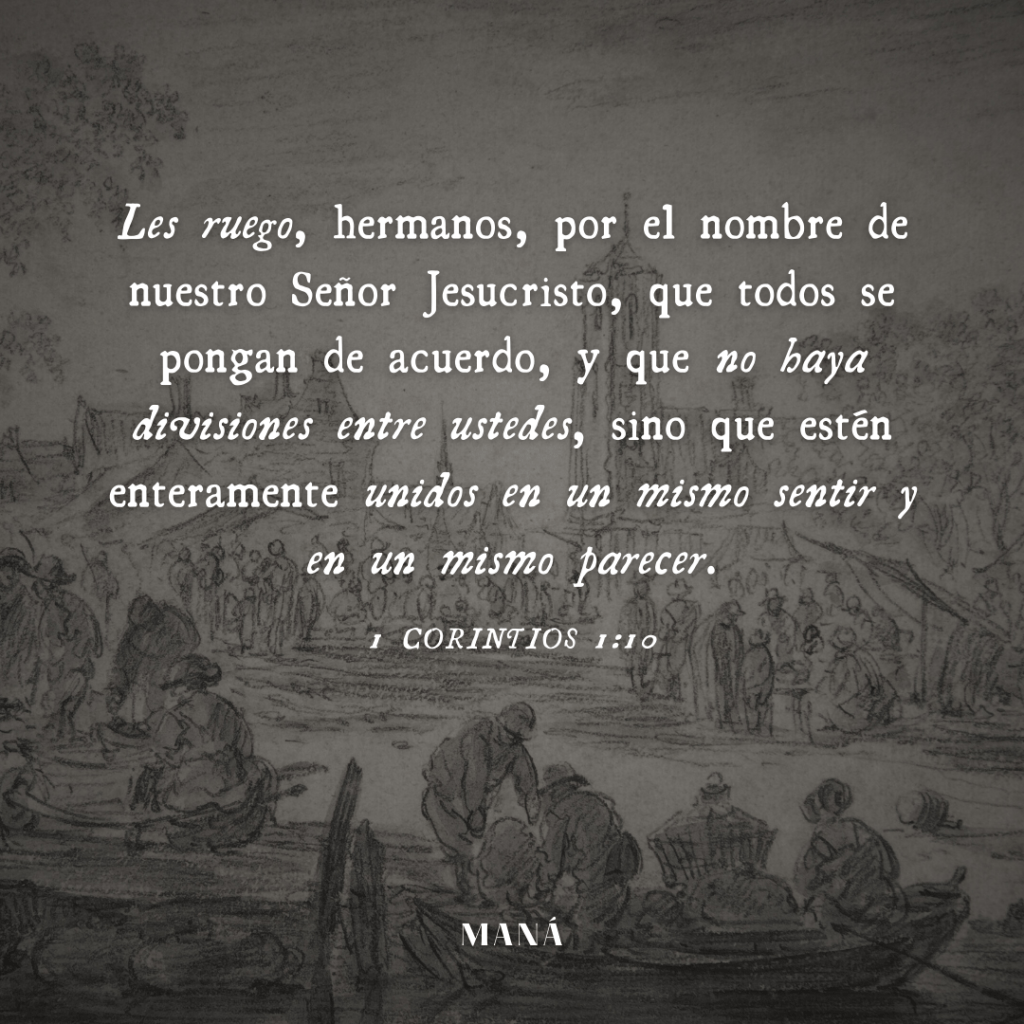 Les ruego, hermanos, por el nombre de nuestro Señor Jesucristo, que todos se pongan de acuerdo, y que no haya divisiones entre ustedes, sino que estén enteramente unidos en un mismo sentir y en un mismo parecer.