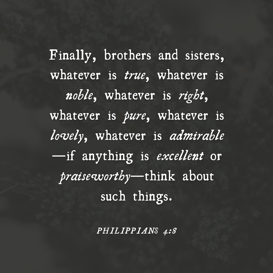 Enfin, frères et sœurs, nourrissez vos pensées de tout ce qui est vrai, noble, juste, pur, digne d’amour ou d’approbation, de tout ce qui est vertueux et mérite louange.