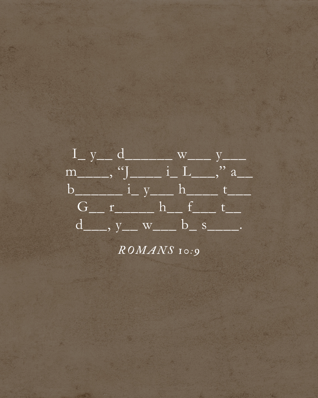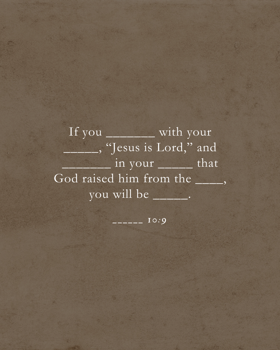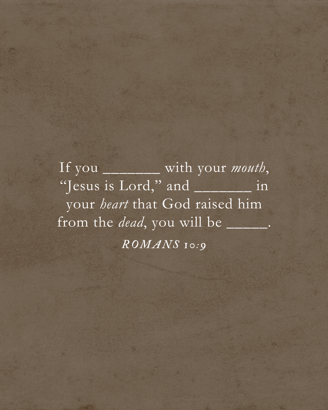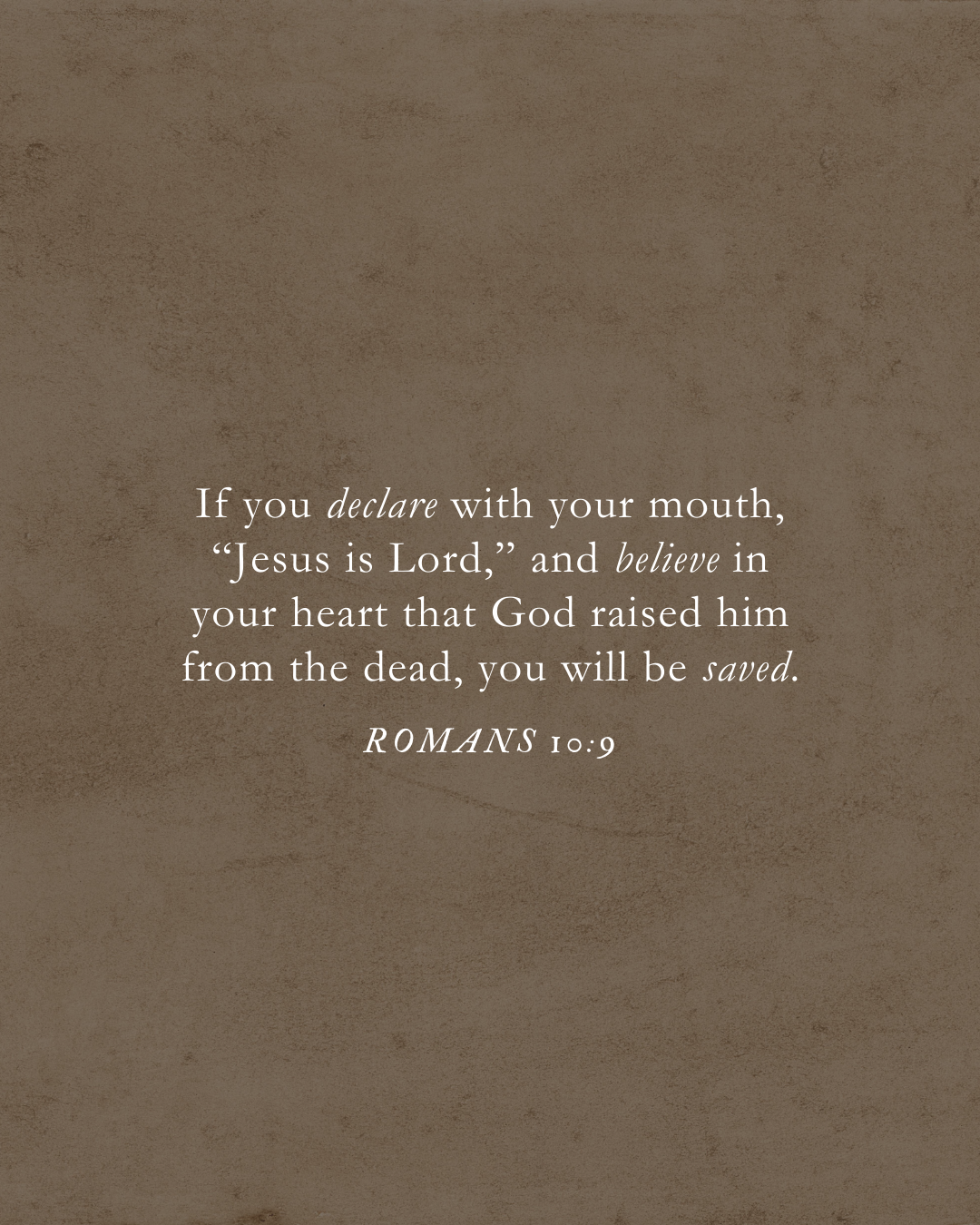 إنْ أعلَنتَ بِشَفَتَيْكَ، وَآمَنتَ بِقَلْبِكَ، أنَّ يَسُوعَ رَبٌّ وَأنَّ اللهَ أقَامَهُ مِنَ المَوْتِ، خَلُصْتَ.