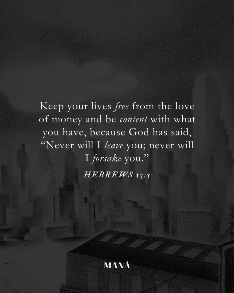 Instead of getting caught up in the hustle of making money, we are called to be content with what we have. What we believers possess, no one can buy. We have accepted the gift of grace, which is eternal life. No amount of earthly wealth can pass through the golden gates. Deuteronomy 31:6 and 8 encourages us not to lose sight of the greatest riches a person can have: the unrelenting and trusting care of our Creator, who will never abandon us. Psalm 118:6-7 is also quoted to emphasize our reassurance in the Lord and His ability to protect and provide for us.