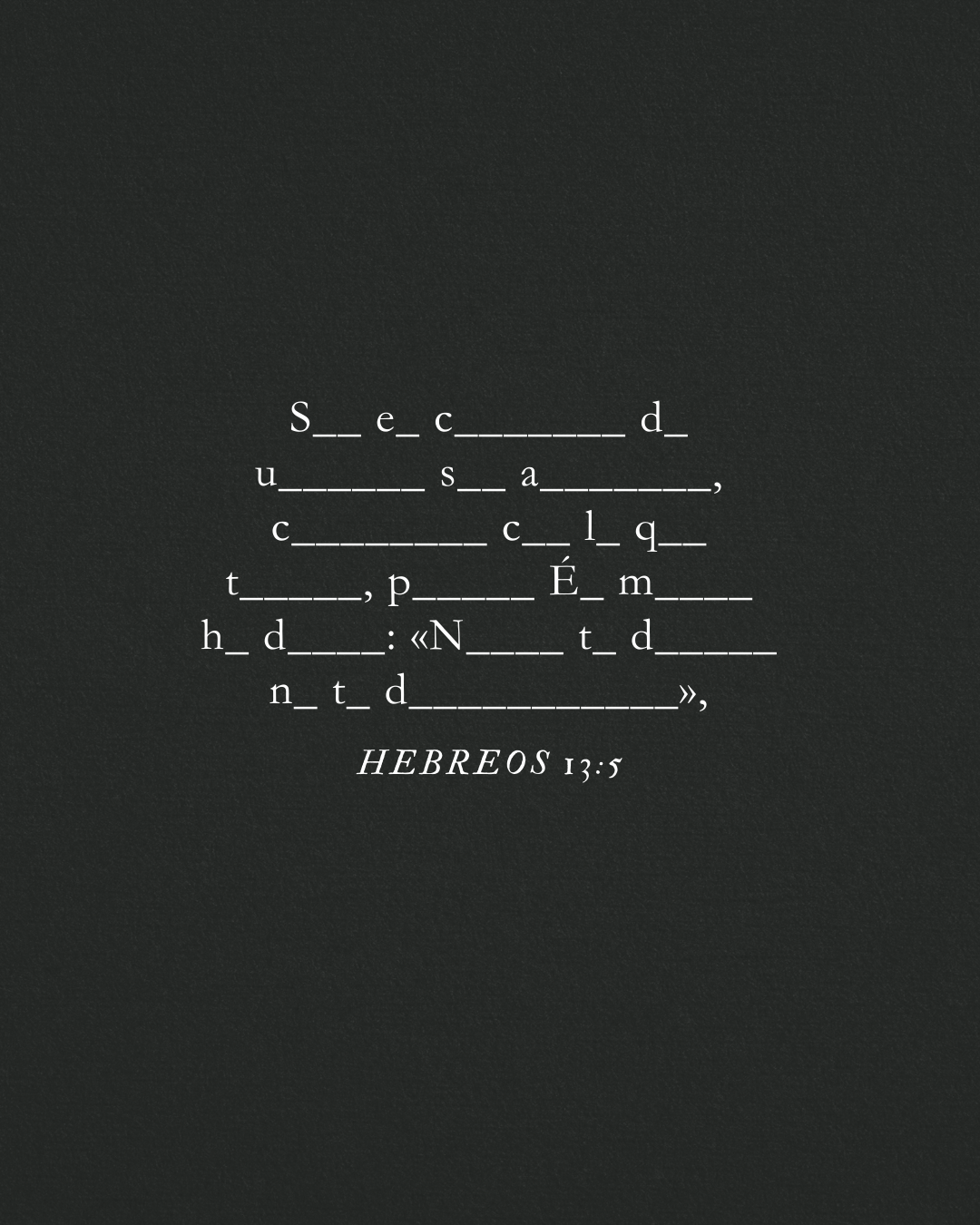 Que votre conduite ne soit pas guidée par l’amour de l’argent. Contentez-vous de ce que vous avez présentement. Car Dieu lui-même a dit : Je ne te laisserai pas : non, je ne t’abandonnerai jamais.