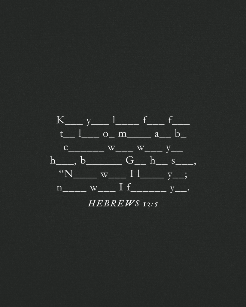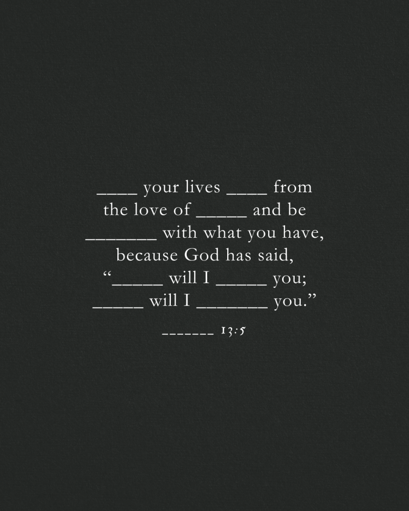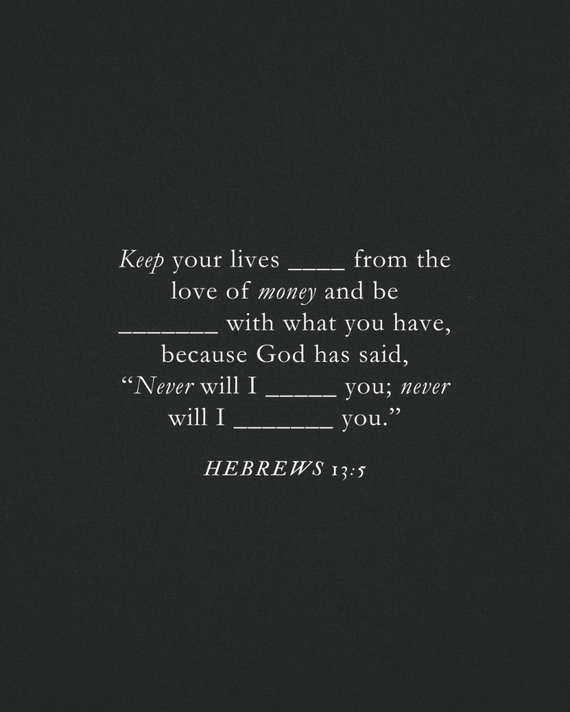 你 們 存 心 不 可 貪 愛 錢 財 , 要 以 自 己 所 有 的 為 足 ; 因 為 主 曾 說 : 我 總 不 撇 下 你 , 也 不 丟 棄 你 。
