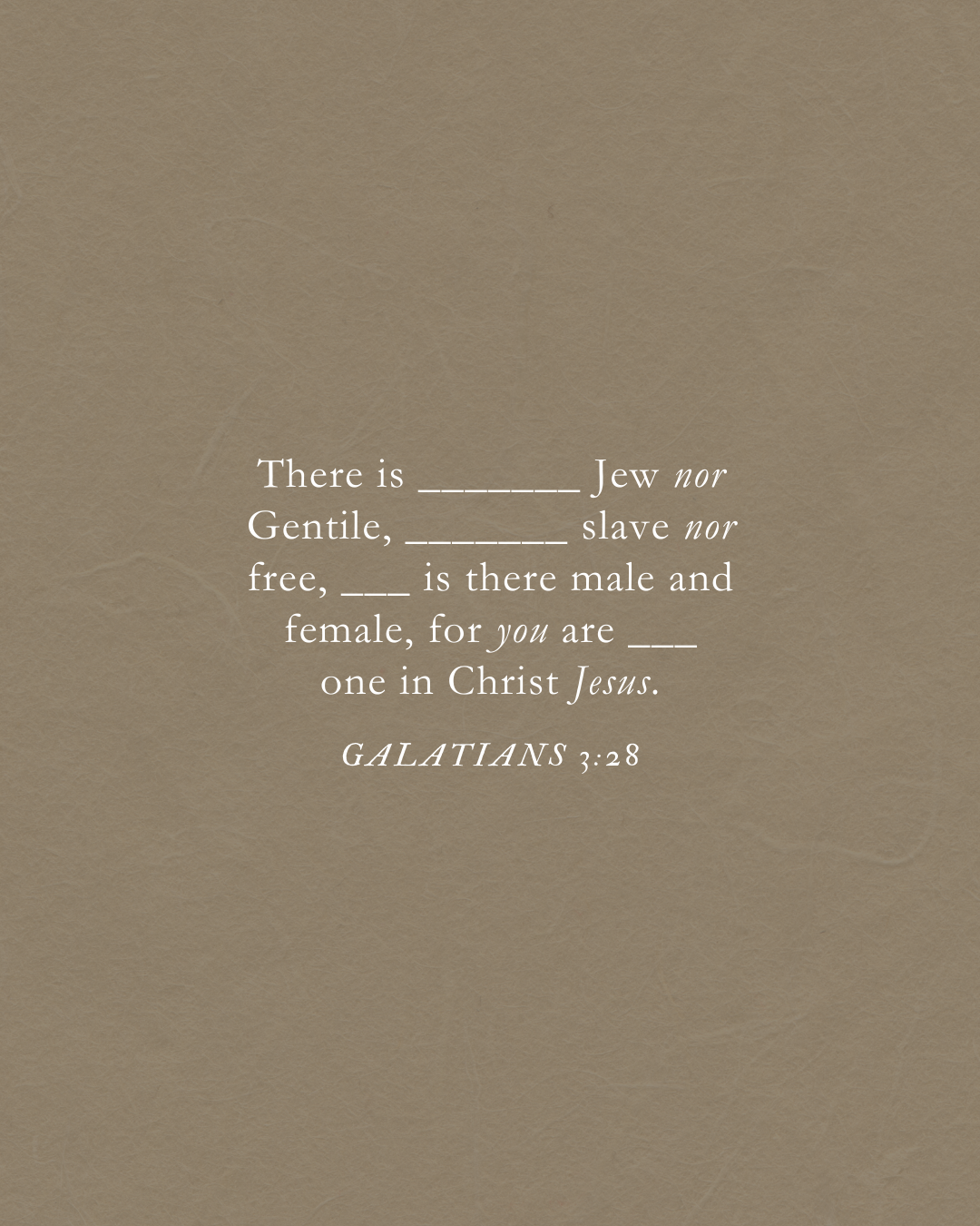 لَا فَرْقَ بَيْنَ اليَهُودِيِّ وَاليُونَانِيِّ، وَلَا بَيْنَ العَبْدِ وَالحُرِّ، وَلَا بَيْنَ الذَّكَرِ وَالأُنثَى، لِأنَّكُمْ جَمِيعًا وَاحِدٌ فِي المَسِيحِ يَسُوعَ.