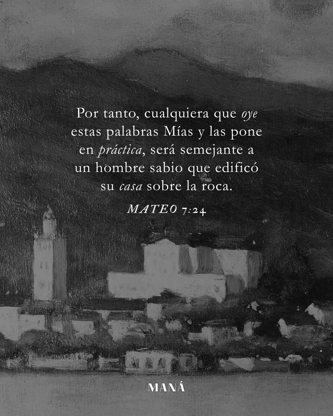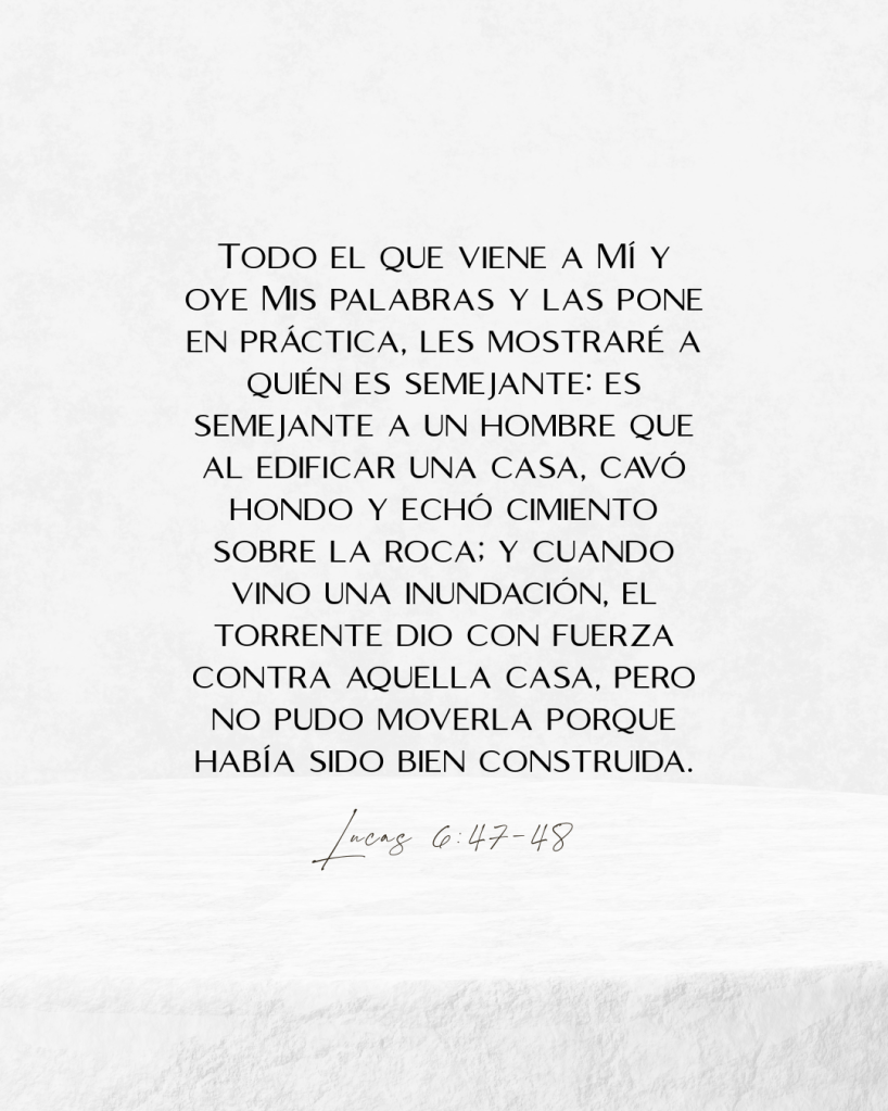 »Por tanto, cualquiera que oye estas palabras Mías y las pone en práctica, será semejante a un hombre sabio que edificó su casa sobre la roca; y cayó la lluvia, vinieron los torrentes, soplaron los vientos y azotaron aquella casa; pero no se cayó, porque había sido fundada sobre la roca.