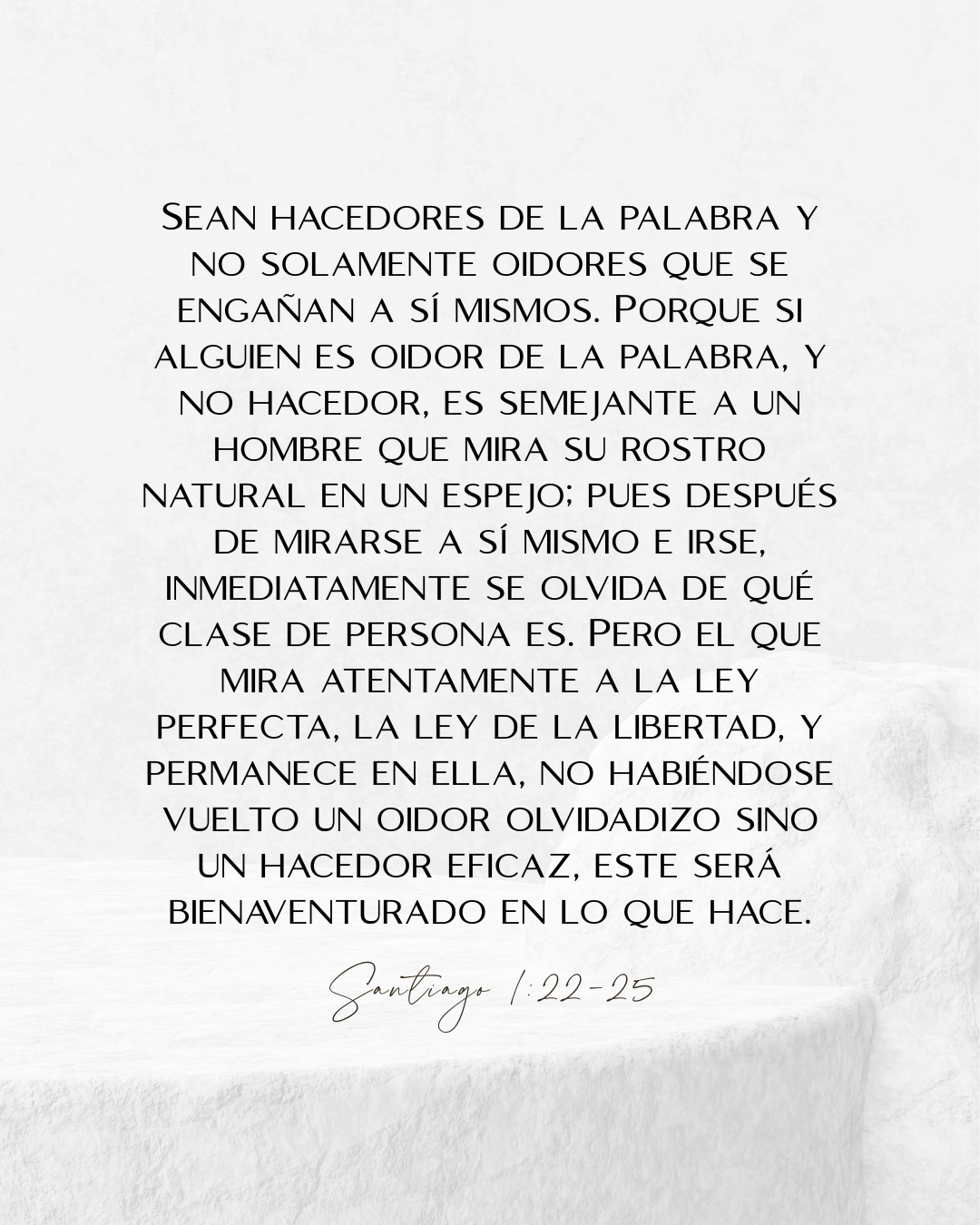 Sean hacedores de la palabra y no solamente oidores que se engañan a sí mismos. Porque si alguien es oidor de la palabra, y no hacedor, es semejante a un hombre que mira su rostro natural en un espejo; pues después de mirarse a sí mismo e irse, inmediatamente se olvida de qué clase de persona es. Pero el que mira atentamente a la ley perfecta, la ley de la libertad, y permanece en ella, no habiéndose vuelto un oidor olvidadizo sino un hacedor eficaz, este será bienaventurado en lo que hace.