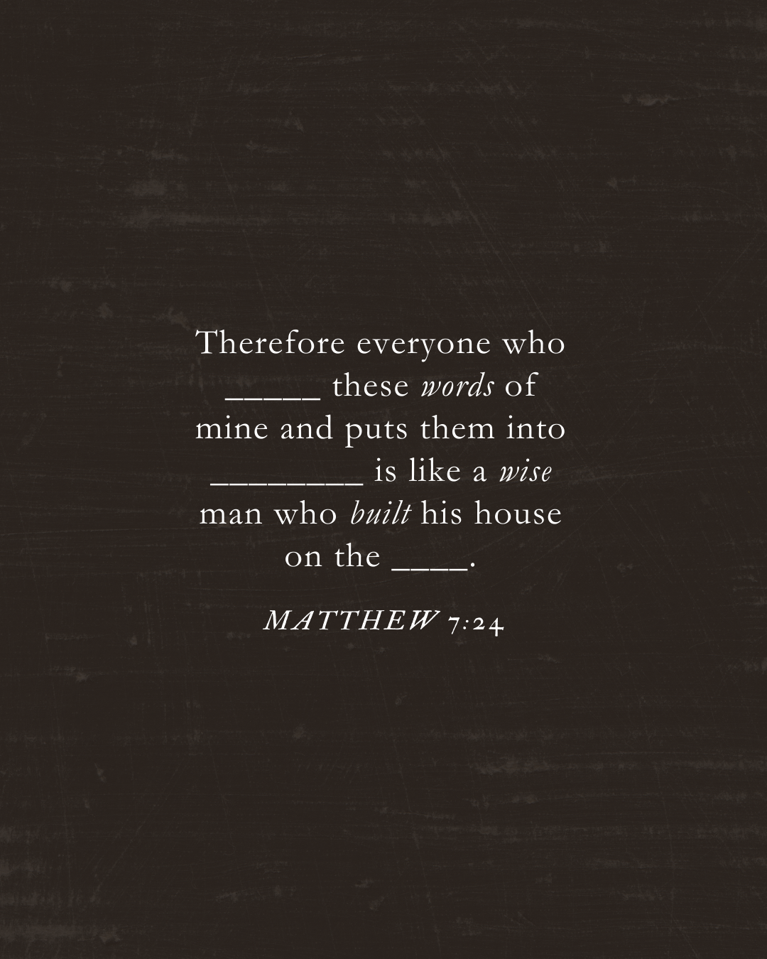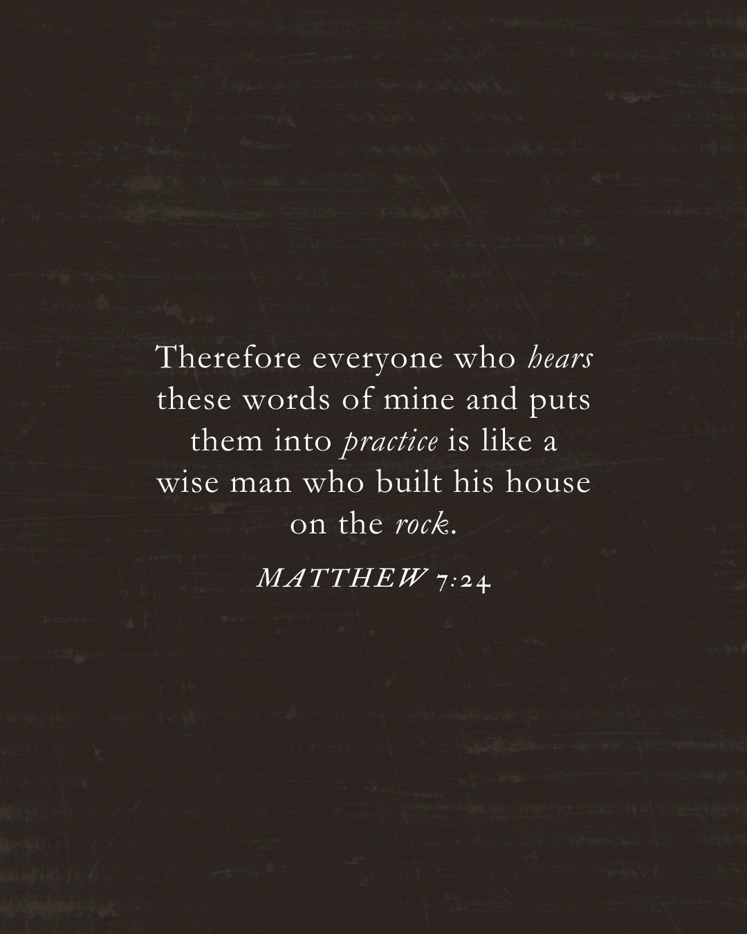 »Por tanto, cualquiera que oye estas palabras Mías y las pone en práctica, será semejante a un hombre sabio que edificó su casa sobre la roca.