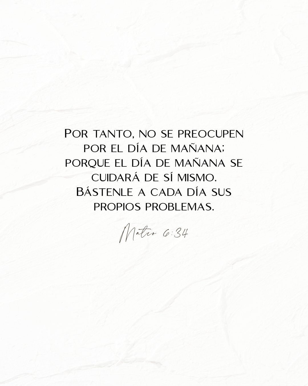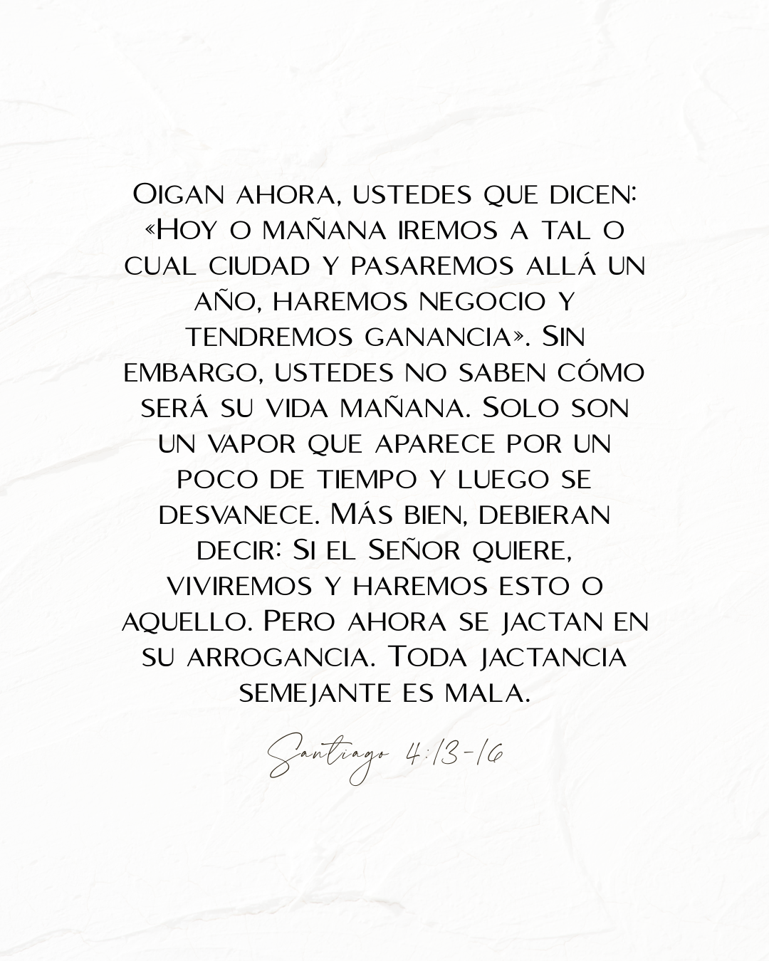 En Santiago 4:13-14, el discípulo escribe: «¡Vamos! Los que decís: “Hoy o mañana iremos a tal ciudad, estaremos allí un año, compraremos y venderemos, y ganaremos; cuando no sabéis qué será mañana”». En el versículo 15, en cambio, deberíais decir: “Si el Señor quiere, viviremos y haremos esto o aquello”. ¿Confiamos demasiado en nosotros mismos? ¿Oramos durante nuestras sesiones de planificación, implorando sabiduría a Dios? Charles Spurgeon dijo una vez: «Consideren la bendición de no saber qué nos deparará el día». ¿Se imaginan saber cómo será el mañana? ¿Cambiaría eso sus planes a corto o a largo plazo?