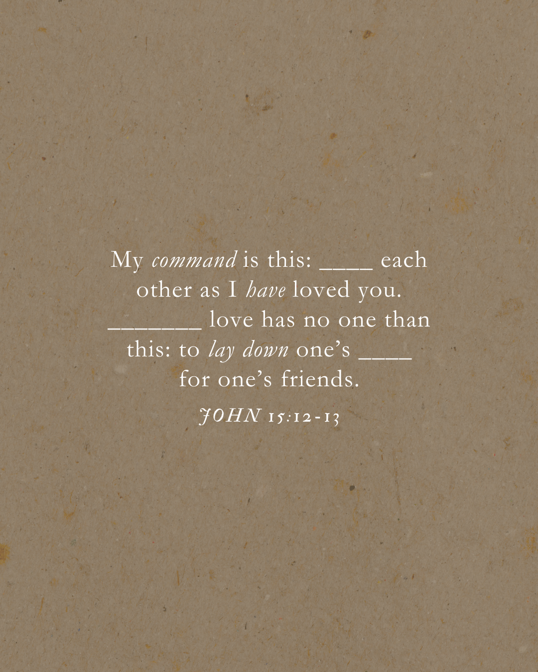Este es Mi mandamiento: que se amen los unos a los otros, así como Yo los he amado. Nadie tiene un amor mayor que este: que uno désu vidapor sus amigos.