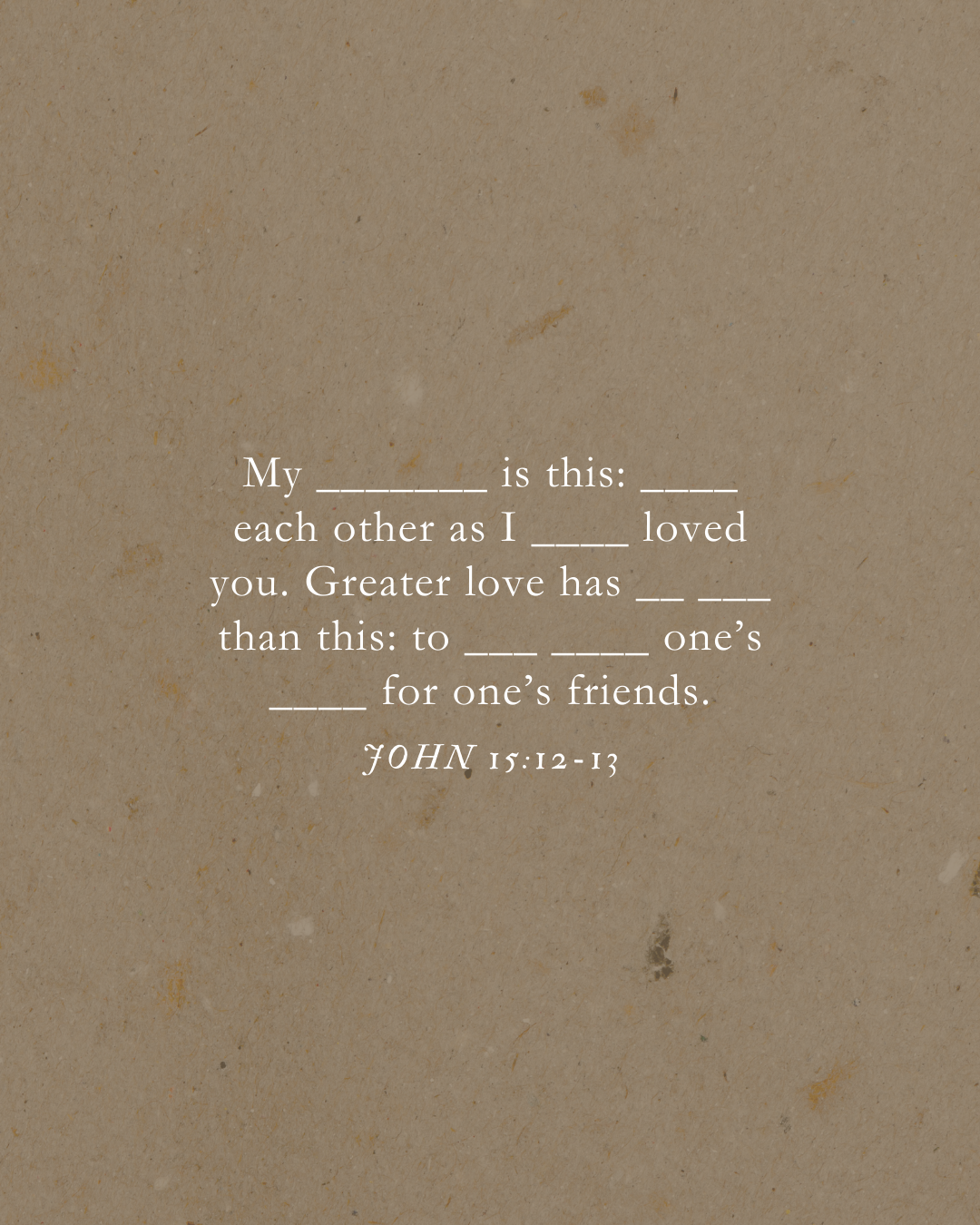 «وَهَذِهِ هِيَ وَصِيَّتِي لَكُمْ: أحِبُّوا بَعْضُكُمْ بَعْضًا كَمَا أحبَبْتُكُمْ أنَا. أعْظَمُ مَحَبَّةٍ هِيَ مَحَبَّةُ مَنْ يَضَحِّي بِنَفْسِهِ مِنْ أجْلِ أحِبَّائِهِ.