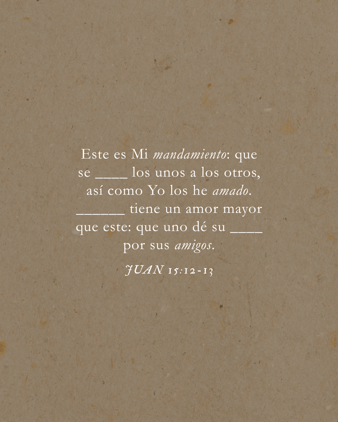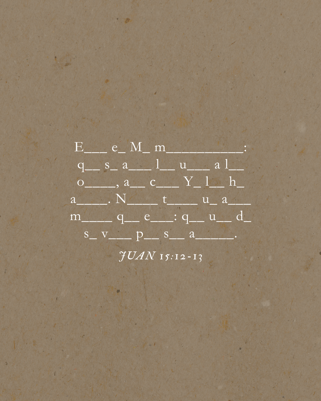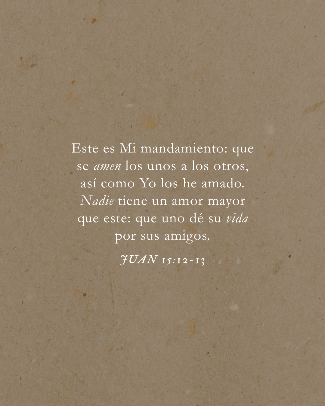 «وَهَذِهِ هِيَ وَصِيَّتِي لَكُمْ: أحِبُّوا بَعْضُكُمْ بَعْضًا كَمَا أحبَبْتُكُمْ أنَا. أعْظَمُ مَحَبَّةٍ هِيَ مَحَبَّةُ مَنْ يَضَحِّي بِنَفْسِهِ مِنْ أجْلِ أحِبَّائِهِ.