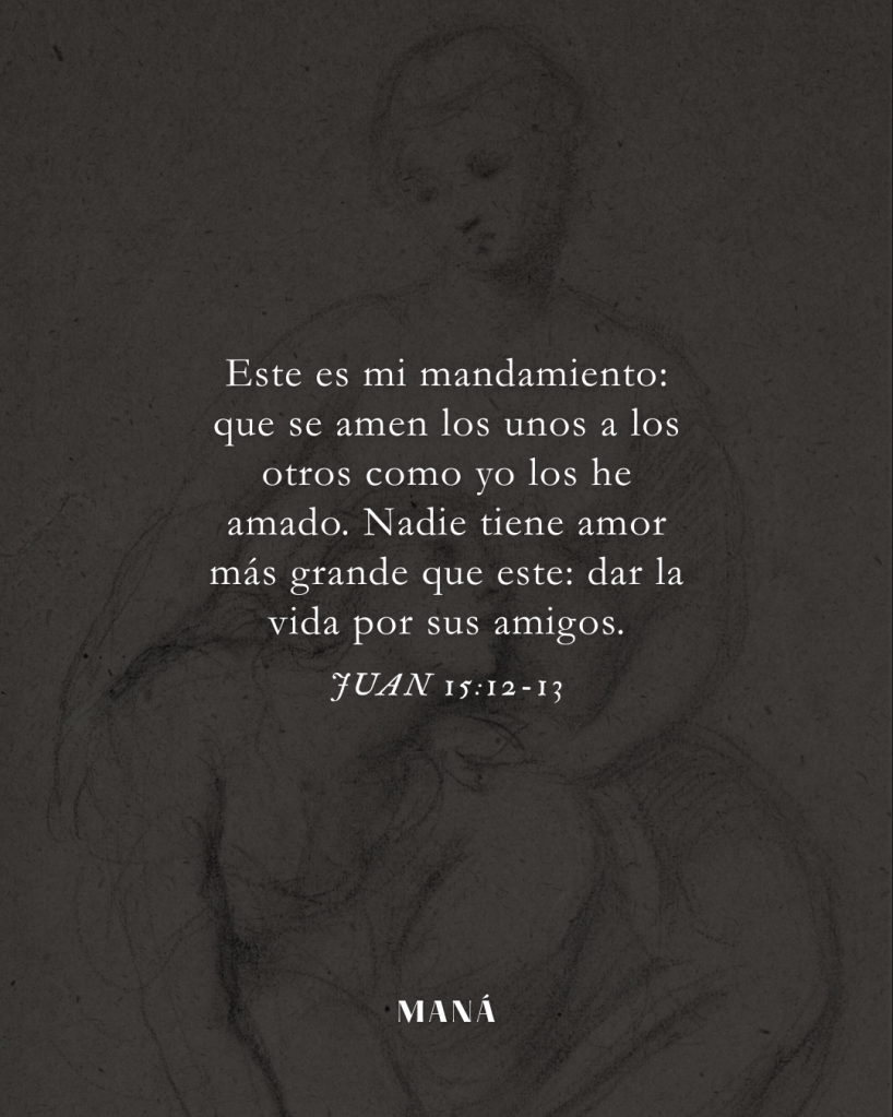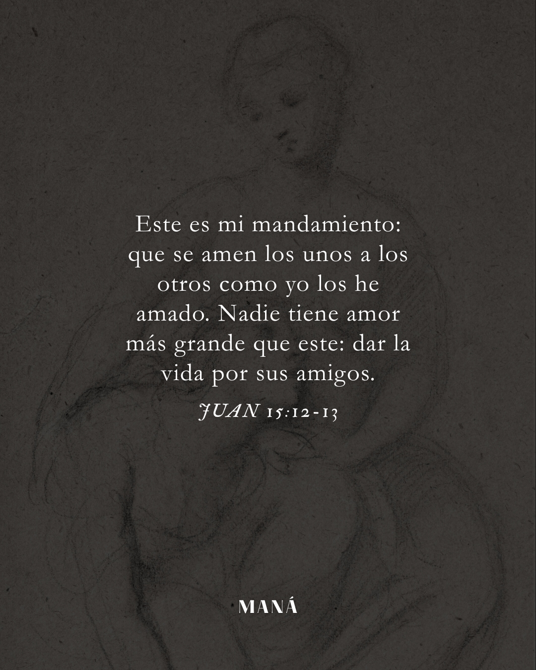 Este es Mi mandamiento: que se amen los unos a los otros, así como Yo los he amado. Nadie tiene un amor mayor que este: que uno désu vidapor sus amigos. Ustedes son Mis amigossi hacen lo que Yo les mando. Ya no los llamo siervos, porque el siervo no sabe lo que hace su señor; pero los he llamado amigos, porque les he dado a conocer todo lo que he oído de Mi Padre.
