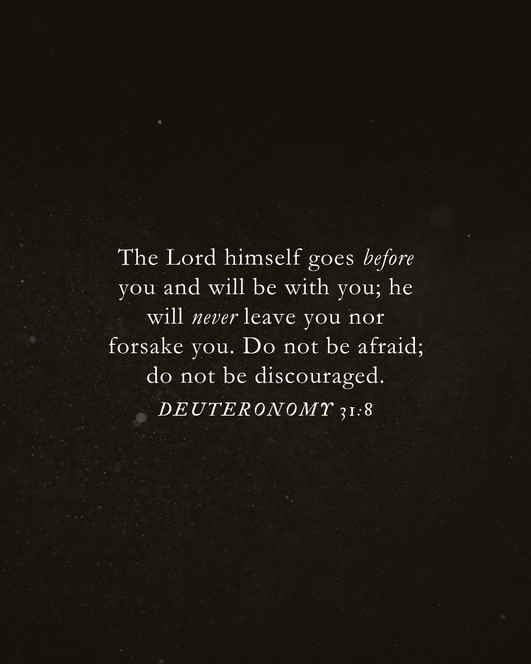 耶 和 华 必 在 你 前 面 行 ; 他 必 与 你 同 在 , 必 不 撇 下 你 , 也 不 丢 弃 你 。 不 要 惧 怕 , 也 不 要 惊 惶 。