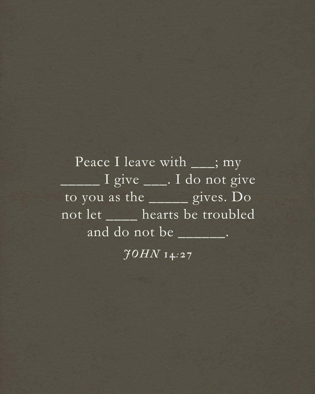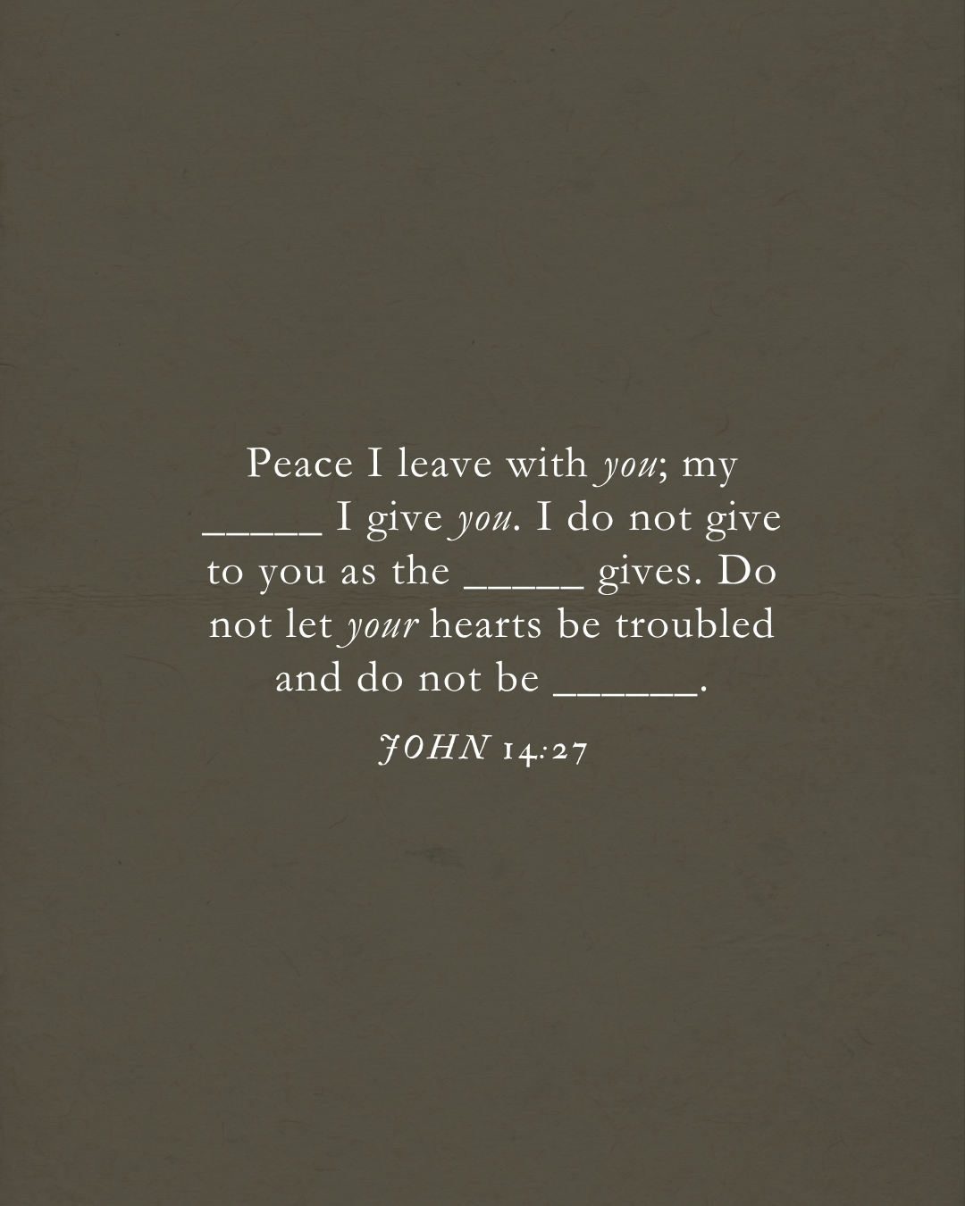 «أتْرُكُ لَكُمْ سَلَامًا. أُعْطِيكُمْ سَلَامِي أنَا. لَا أُعْطِيكُمْ سَلَامًا كَالَّذِي يُعطِيهِ العَالَمُ. فَلَا تَضْطَرِبْ قُلُوبُكُمْ أوْ تَجْبُنْ.