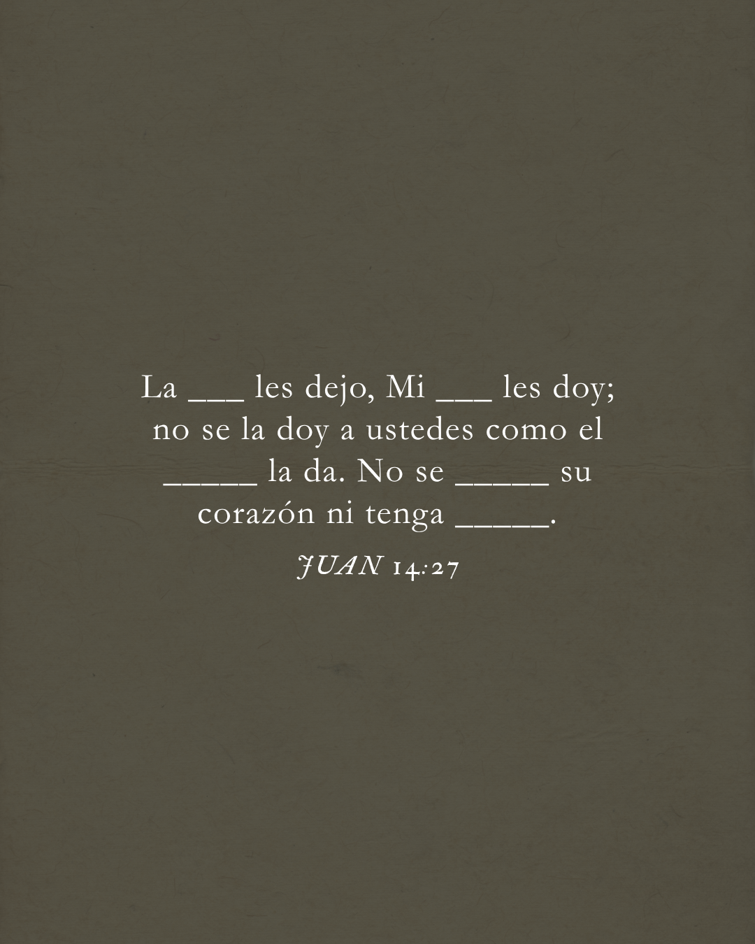 «أتْرُكُ لَكُمْ سَلَامًا. أُعْطِيكُمْ سَلَامِي أنَا. لَا أُعْطِيكُمْ سَلَامًا كَالَّذِي يُعطِيهِ العَالَمُ. فَلَا تَضْطَرِبْ قُلُوبُكُمْ أوْ تَجْبُنْ.