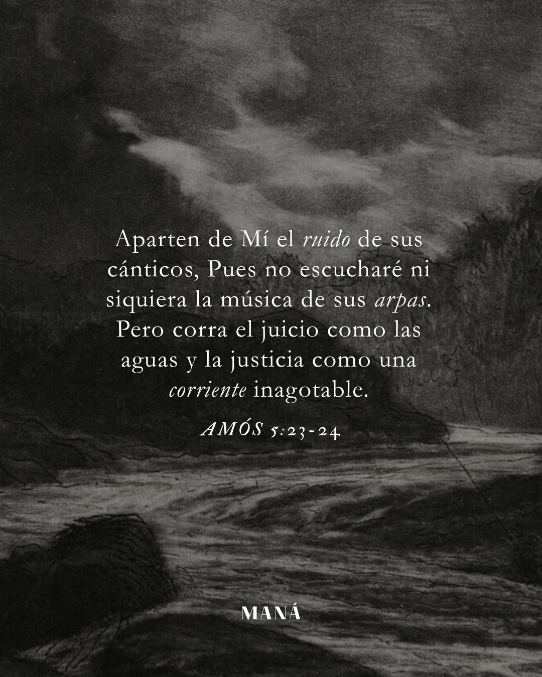 -»Aparten de Mí el ruido de sus cánticos, pues no escucharé ni siquiera la música de sus arpas. -»Pero corra el juicio como las aguas y la justicia como una corriente inagotable.