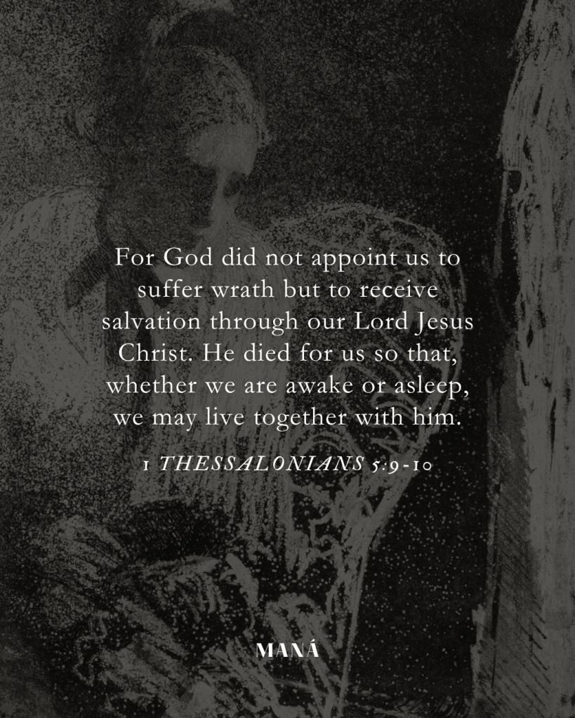 But you, brothers and sisters, are not in darkness so that this day should surprise you like a thief. You are all children of the light and children of the day. We do not belong to the night or to the darkness. So then, let us not be like others, who are asleep, but let us be awake and sober. For those who sleep, sleep at night, and those who get drunk, get drunk at night. But since we belong to the day, let us be sober, putting on faith and love as a breastplate, and the hope of salvation as a helmet. For God did not appoint us to suffer wrath but to receive salvation through our Lord Jesus Christ. He died for us so that, whether we are awake or asleep, we may live together with him.
