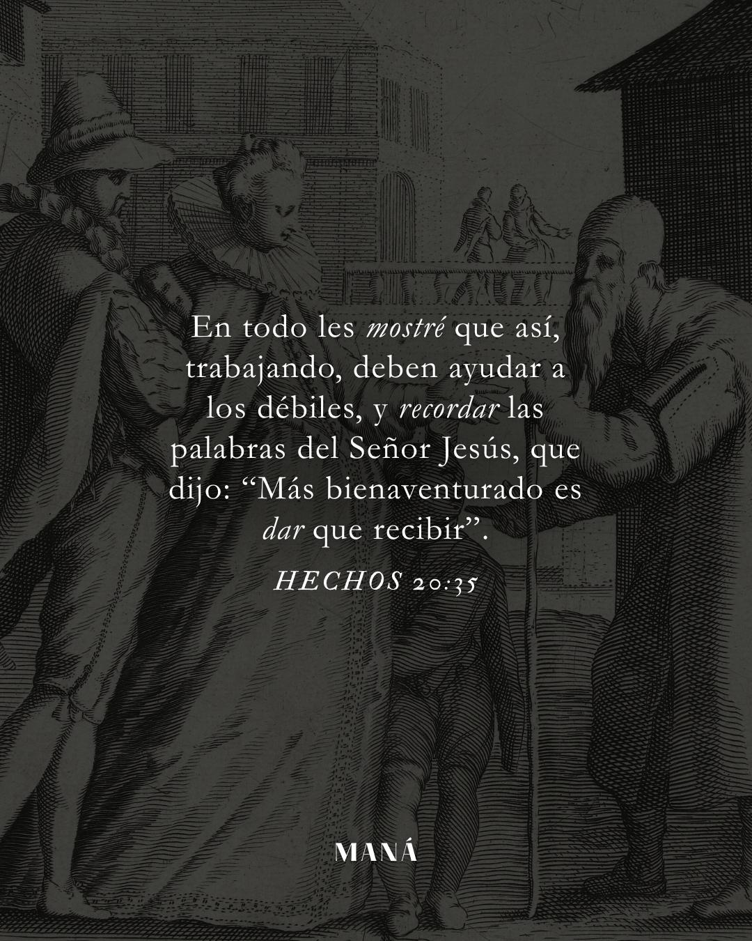 »Ahora los encomiendo a Dios y a la palabra de Su gracia, que es poderosa para edificarlos y darles la herencia entre todos los santificados. Ni la plata, ni el oro, ni la ropa de nadie he codiciado. Ustedes saben que estas manos me sirvieron para mis propias necesidades y las de los que estaban conmigo. En todo les mostré que así, trabajando, deben ayudar a los débiles, y recordar las palabras del Señor Jesús, que dijo: “Más bienaventurado es dar que recibir”».