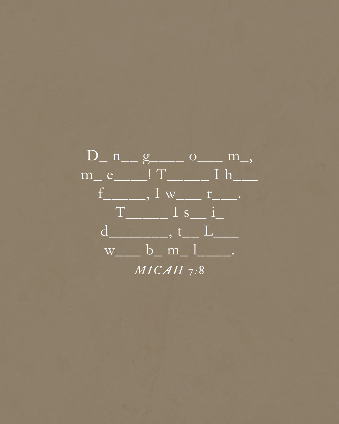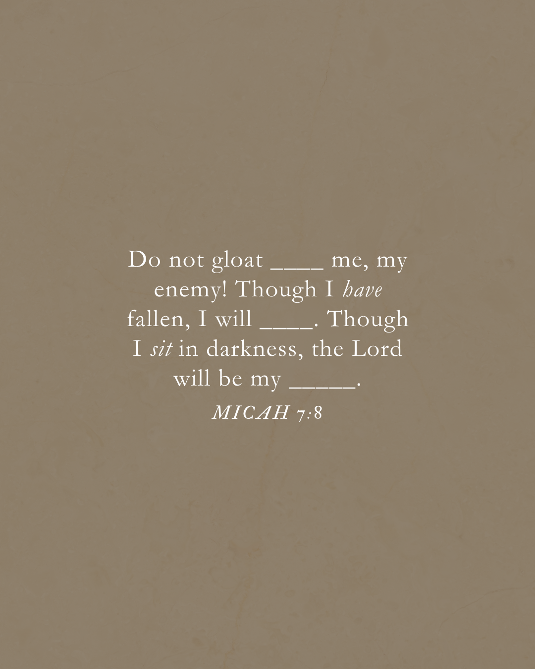 我 的 仇 敌 啊 , 不 要 向 我 夸 耀 。 我 虽 跌 倒 , 却 要 起 来 ; 我 虽 坐 在 黑 暗 里 , 耶 和 华 却 作 我 的 光 。